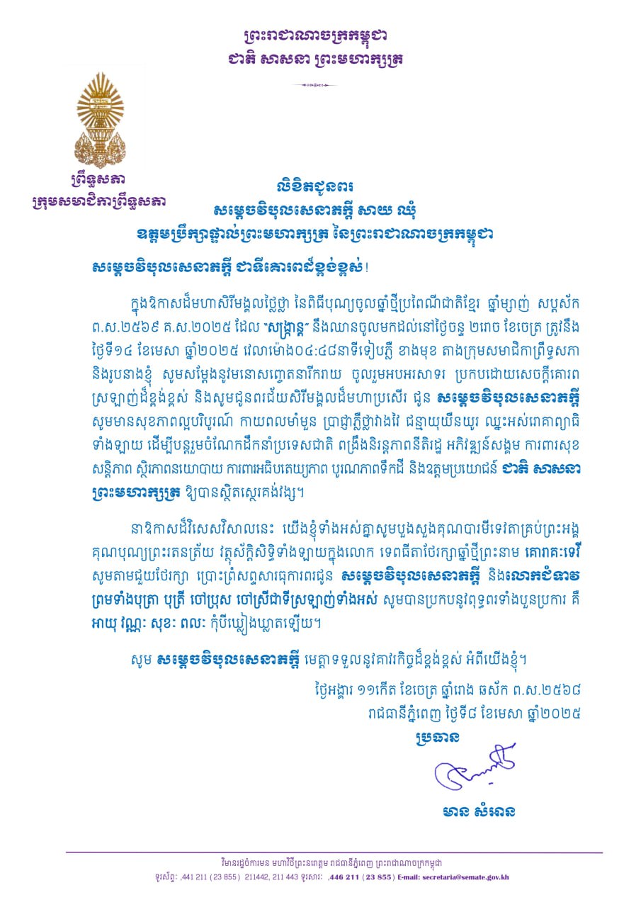 សារលិខិតជូនពរ របស់ ក្រុមសមាជិកាព្រឹទ្ធសភា សូមគោរពជូន សម្តេចវិបុលសេនាភក្តី សាយ ឈុំ ឧត្តមប្រឹក្សាផ្ទាល់ព្រះមហាក្សត្រ នៃព្រះរាជាណាចក្រកម្ពុជា