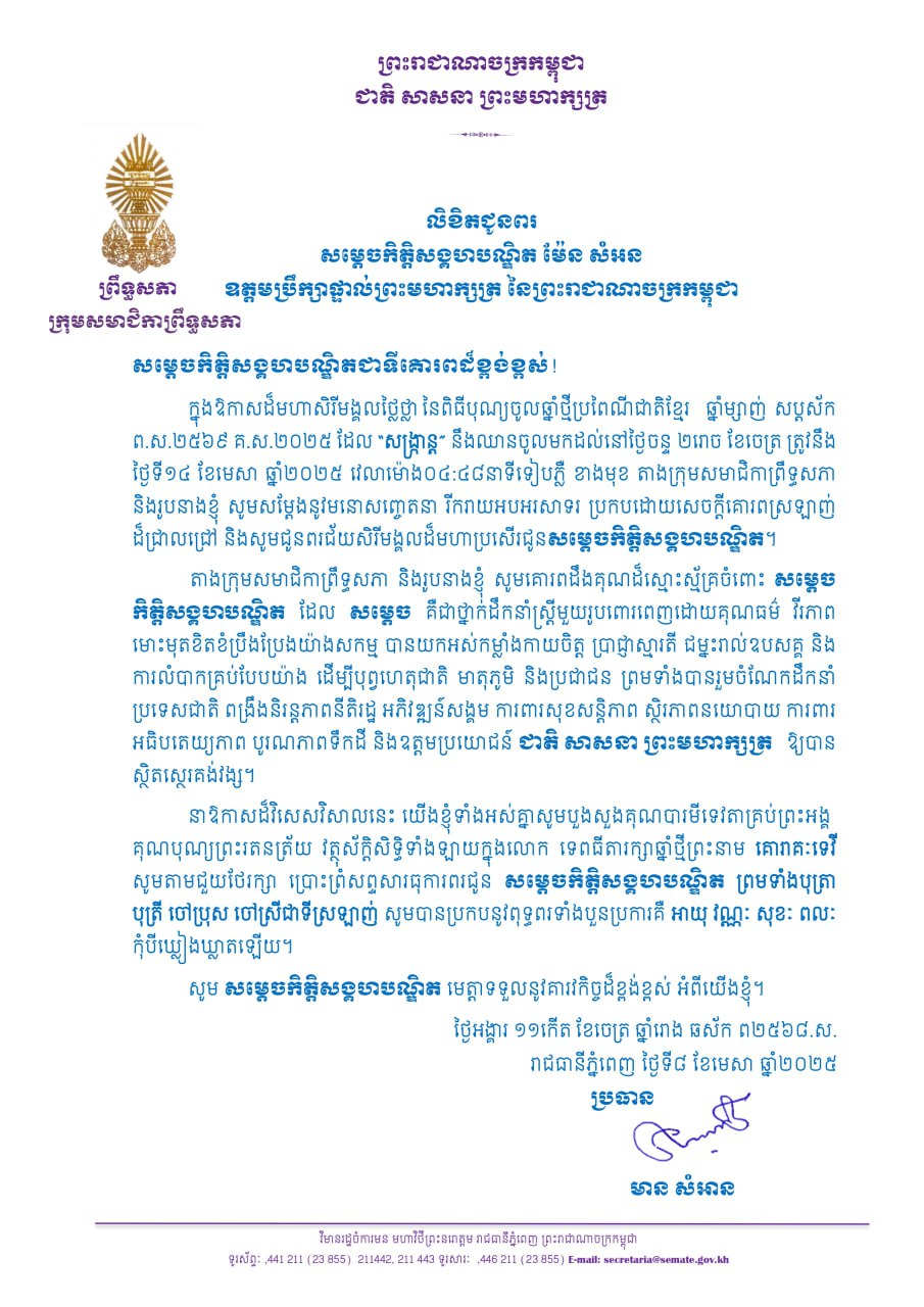• សារលិខិតជូនពរ របស់ ក្រុមសមាជិកាព្រឹទ្ធសភា សូមគោរពជូន សម្តេចកិត្តិសង្គហបណ្ឌិត ម៉ែន សំអន ឧត្តមប្រឹក្សាផ្ទាល់ព្រះមហាក្សត្រនៃព្រះរាជាណាចក្រកម្ពុជា