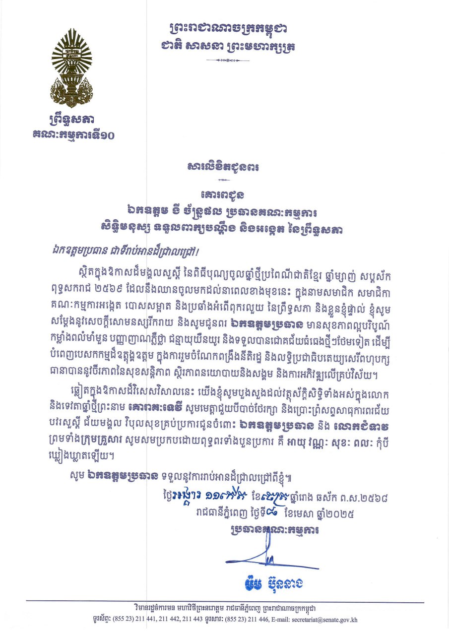 សារលិខិតជូនពររបស់ឯកឧត្តម ម៉ម ប៊ុននាង ប្រធានគណៈកម្មការទី១០ព្រឹទ្ធសភា ជូនពរក្នុងឱកាសពិធីបុណ្យចូលឆ្នាំថ្មីប្រពៃណីជាតិខ្មែរ ឆ្នាំម្សាញ់ សប្តស័ក ព.ស.២៥៦៩ គោរពជូន ឯកឧត្តម ងី ច័ន្ទ្រផល ប្រធានគណៈកម្មការ សិទ្ធិមនុស្ស ទទួលពាក្យបណ្តឹងនិងអង្កេត និងអធិការកិច្ច នៃព្រឹទ្ធសភា