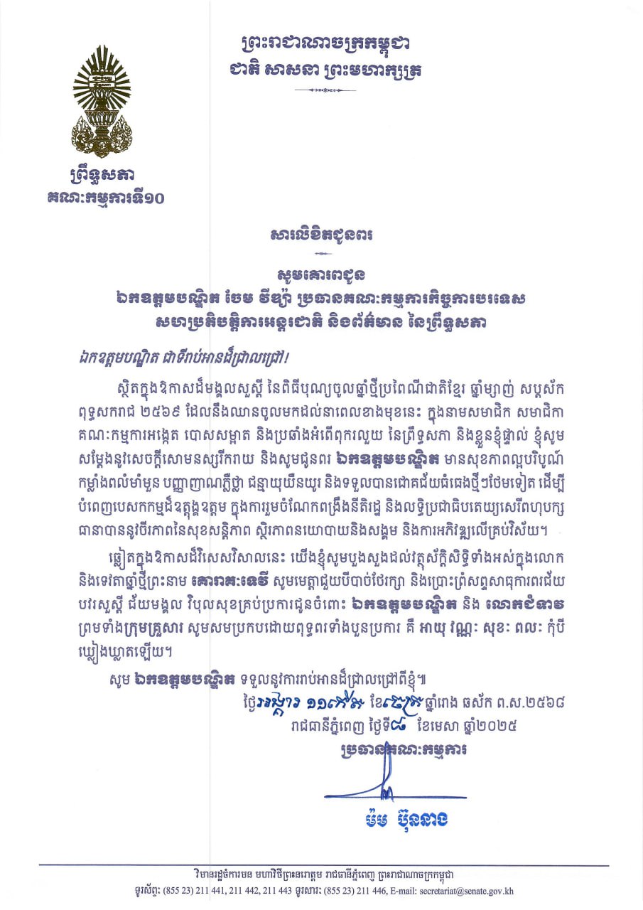 សារលិខិតជូនពររបស់ឯកឧត្តម ម៉ម ប៊ុននាង ប្រធានគណៈកម្មការទី១០ព្រឹទ្ធសភា ជូនពរក្នុងឱកាសពិធីបុណ្យចូលឆ្នាំថ្មីប្រពៃណីជាតិខ្មែរ ឆ្នាំម្សាញ់ សប្តស័ក ព.ស.២៥៦៩ គោរពជូន ឯកឧត្តមបណ្ឌិត ចែម វីឌ្យ៉ា ប្រធានគណៈកម្មការកិច្ចការបរទេស សហប្រតិបត្តិការអន្តរជាតិ និងព័ត៌មាននៃព្រឹទ្ធសភា