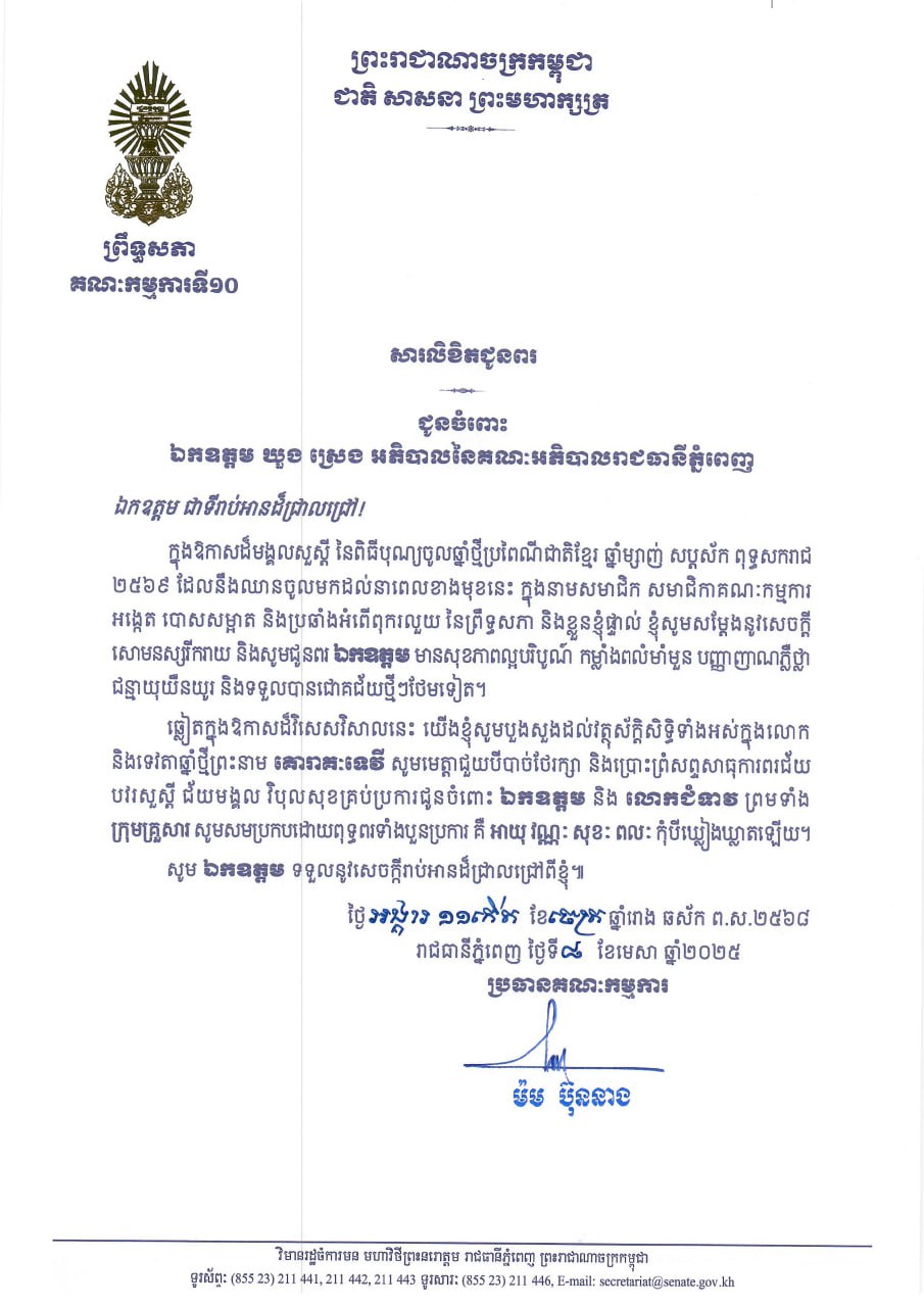 សារលិខិតជូនពររបស់ឯកឧត្តម ម៉ម ប៊ុននាង ប្រធានគណៈកម្មការទី១០ព្រឹទ្ធសភា ជូនពរក្នុងឱកាសពិធីបុណ្យចូលឆ្នាំថ្មីប្រពៃណីជាតិខ្មែរ ឆ្នាំម្សាញ់ សប្តស័ក ព.ស.២៥៦៩ ជូនចំពោះ ឯកឧត្តម ឃួង ស្រេង អភិបាលនៃគណៈអភិបាលរាជធានីភ្នំពេញ