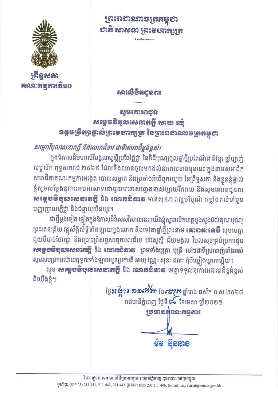 សារលិខិតជូនពររបស់ឯកឧត្តម ម៉ម ប៊ុននាង ប្រធានគណៈកម្មការទី១០ព្រឹទ្ធសភា ជូនពរក្នុងឱកាសពិធីបុណ្យចូលឆ្នាំថ្មីប្រពៃណីជាតិខ្មែរ ឆ្នាំម្សាញ់ សប្តស័ក ព.ស.២៥៦៩ គោរពជូន សម្តេចវិបុលសេនាភក្តី សាយ ឈុំ ឧត្តមប្រឹក្សាផ្ទាល់ព្រះមហាក្សត្រ នៃព្រះរាជាណាចក្រកម្ពុជា