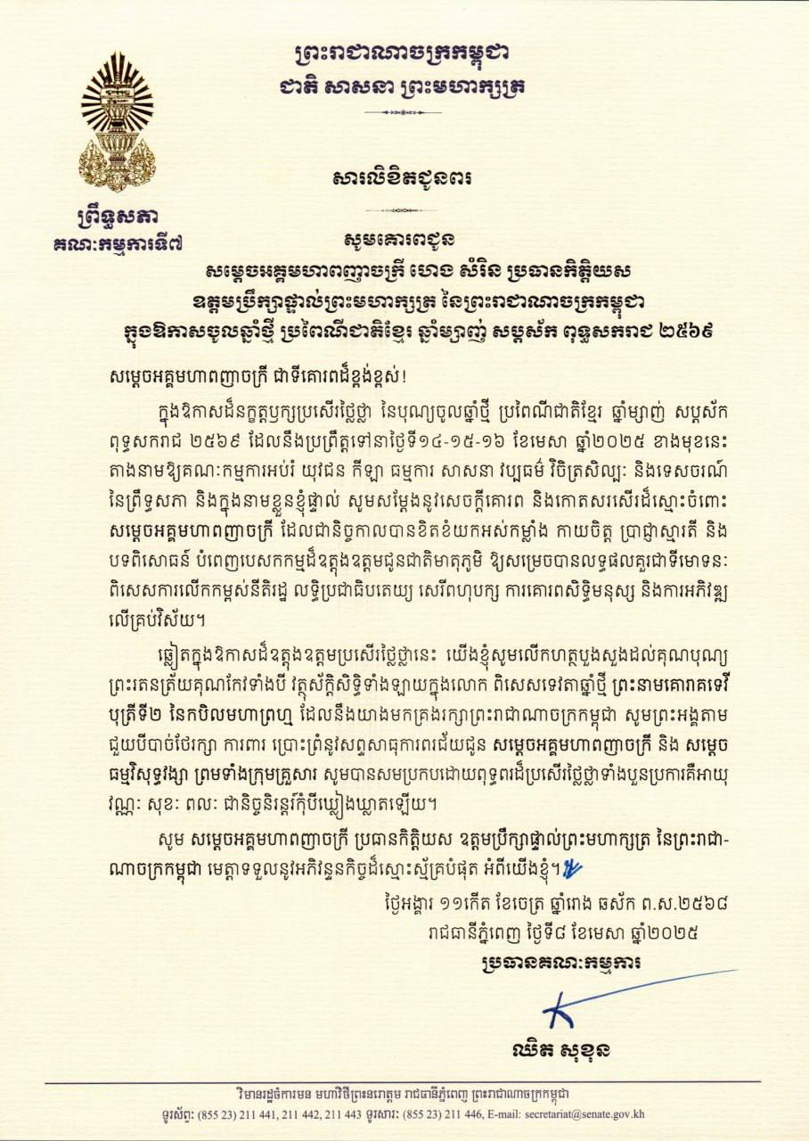 សារលិខិតជូនពរ របស់ ឯកឧត្តម ឈិត សុខុន ប្រធានគណៈកម្មការទី៧ព្រឹទ្ធសភា សូមគោរពជូន សម្តេចអគ្គមហាពញាចក្រី ហេង សំរិន ប្រធានកិត្តិយស ឧត្តមប្រឹក្សាផ្ទាល់ព្រះមហាក្សត្រ នៃព្រះរាជាណាចក្រកម្ពុជា