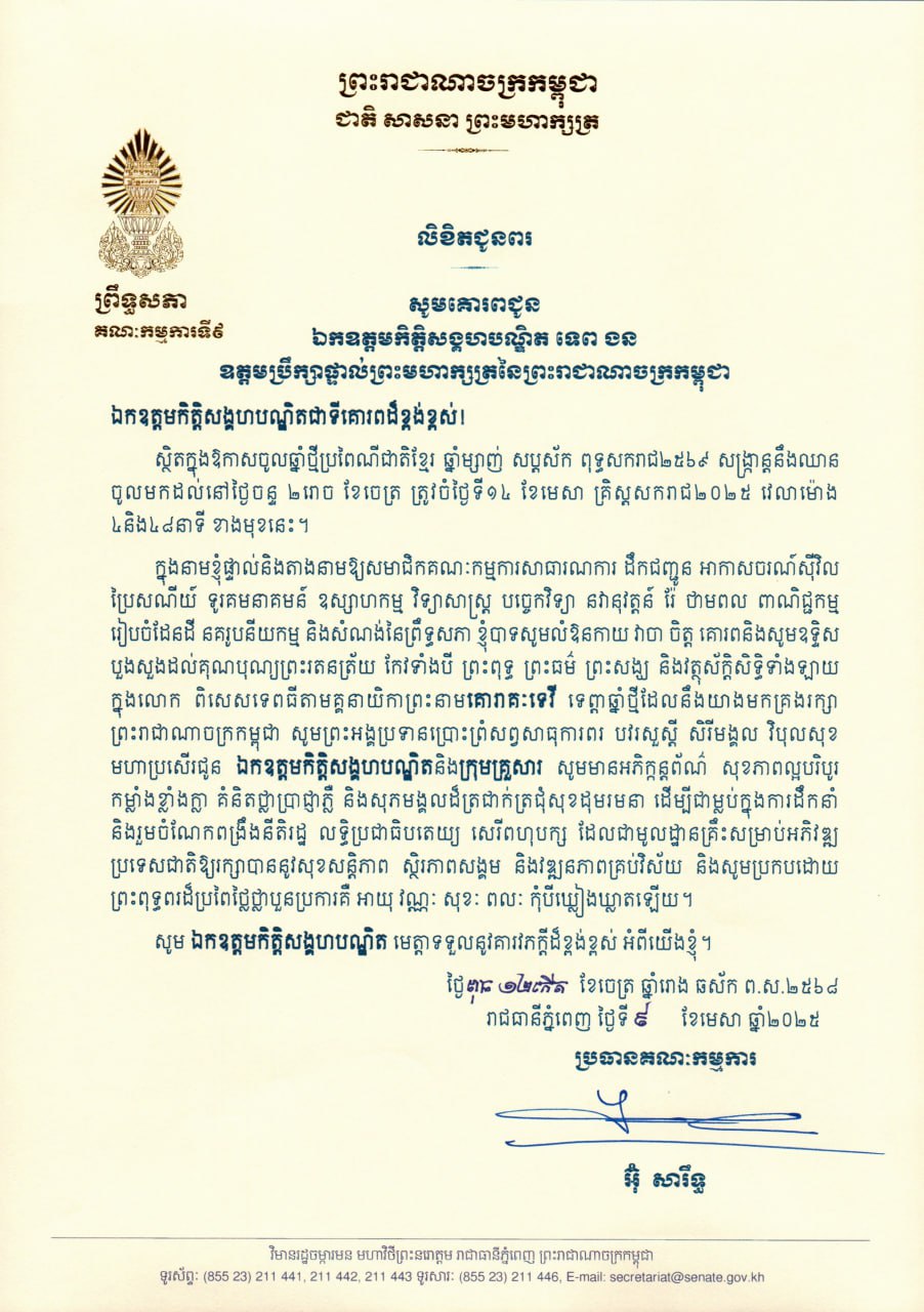 សារលិខិតជូនពររបស់ឯកឧត្តម ឡាយ សំកុល អគ្គលេខាធិការព្រឹទ្ធសភា គោរពជូន សម្តេចកិត្តិព្រឹទ្ធបណ្ឌិត ប៊ុន រ៉ានី ហ៊ុន សែន ប្រធានកាកបាទក្រហមកម្ពុជា ក្នុងឱកាសដ៏ឧត្តុង្គឧត្តមប្រកបដោយក្តីសោមនស្សរីករាយ នៃពិធីចម្រើនជន្មាយុរបស់ សម្តេចកិត្តិព្រឹទ្ធបណ្ឌិត ដែលនឹងប្រព្រឹត្តទៅនៅថ្ងៃទី១៥ ខែធ្នូ ឆ្នាំ២០២៥ ខាងមុខនេះ