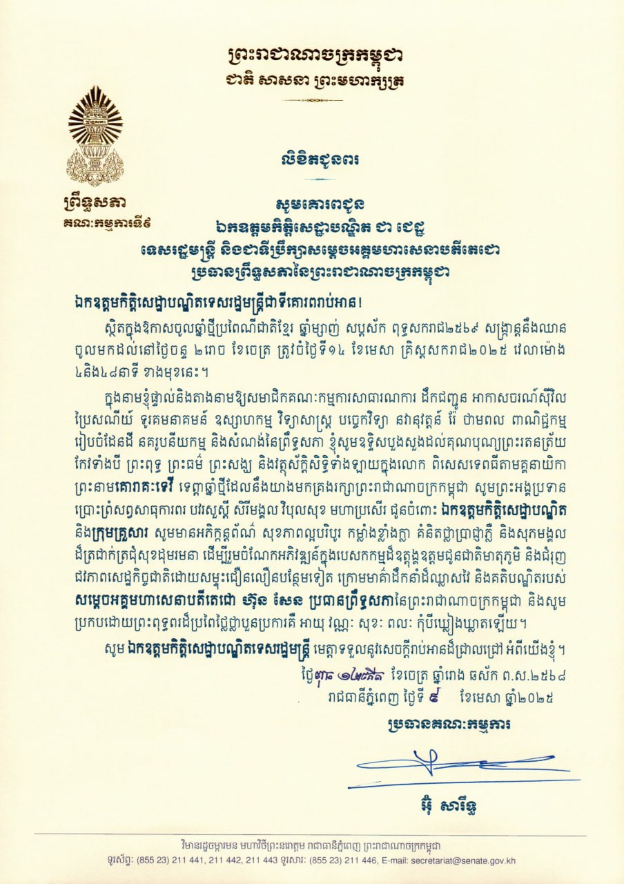 សារលិខិតជូនពររបស់ឯកឧត្តម ឡាយ សំកុល អគ្គលេខាធិការព្រឹទ្ធសភា គោរពជូន សម្តេចកិត្តិព្រឹទ្ធបណ្ឌិត ប៊ុន រ៉ានី ហ៊ុន សែន ប្រធានកាកបាទក្រហមកម្ពុជា ក្នុងឱកាសដ៏ឧត្តុង្គឧត្តមប្រកបដោយក្តីសោមនស្សរីករាយ នៃពិធីចម្រើនជន្មាយុរបស់ សម្តេចកិត្តិព្រឹទ្ធបណ្ឌិត ដែលនឹងប្រព្រឹត្តទៅនៅថ្ងៃទី១៥ ខែធ្នូ ឆ្នាំ២០២៥ ខាងមុខនេះ