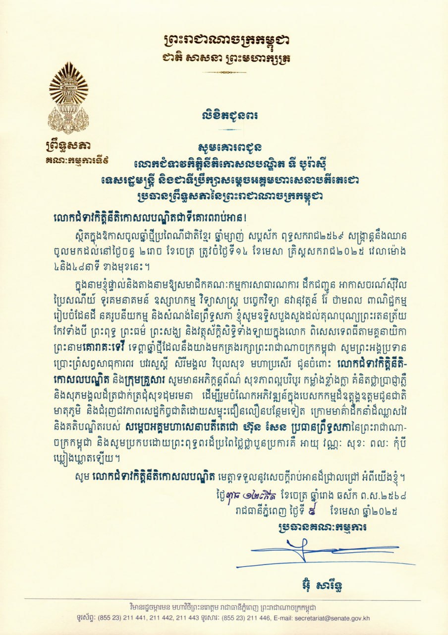 សារលិខិតជូនពររបស់ឯកឧត្តម ឡាយ សំកុល អគ្គលេខាធិការព្រឹទ្ធសភា គោរពជូន សម្តេចកិត្តិព្រឹទ្ធបណ្ឌិត ប៊ុន រ៉ានី ហ៊ុន សែន ប្រធានកាកបាទក្រហមកម្ពុជា ក្នុងឱកាសដ៏ឧត្តុង្គឧត្តមប្រកបដោយក្តីសោមនស្សរីករាយ នៃពិធីចម្រើនជន្មាយុរបស់ សម្តេចកិត្តិព្រឹទ្ធបណ្ឌិត ដែលនឹងប្រព្រឹត្តទៅនៅថ្ងៃទី១៥ ខែធ្នូ ឆ្នាំ២០២៥ ខាងមុខនេះ