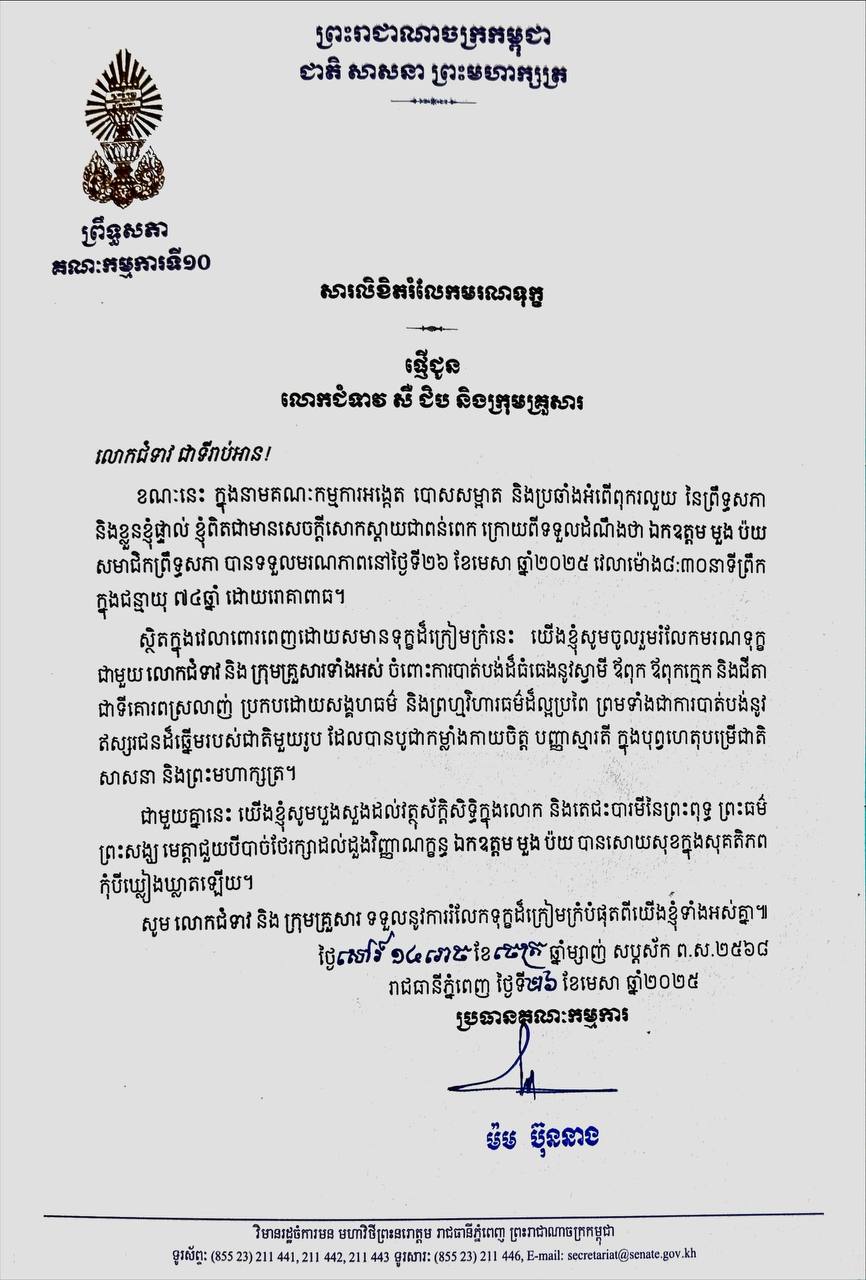 សារលិខិតរំលែកទុក្ខរបស់គណៈកម្មការទី១០ព្រឹទ្ធសភា ផ្ញើជូនលោកជំទាវ សឺ ជិប និងក្រុមគ្រួសារ ចំពោះមរណភាពរបស់ឯកឧត្តម មួង ប៉យ សមាជិកគណៈកម្មការទី៤ព្រឹទ្ធសភា ត្រូវជាស្វាមីរបស់លោកជំទាវ ដែលបានទទួលមរណភាពនាព្រឹកថ្ងៃសៅរ៍ ទី២៦ ខែមេសា ឆ្នាំ២០២៥ វេលាម៉ោង ០៨:៣០នាទី ក្នុងជន្មាយុ ៧៤ឆ្នាំ ដោយរោគាពាធ