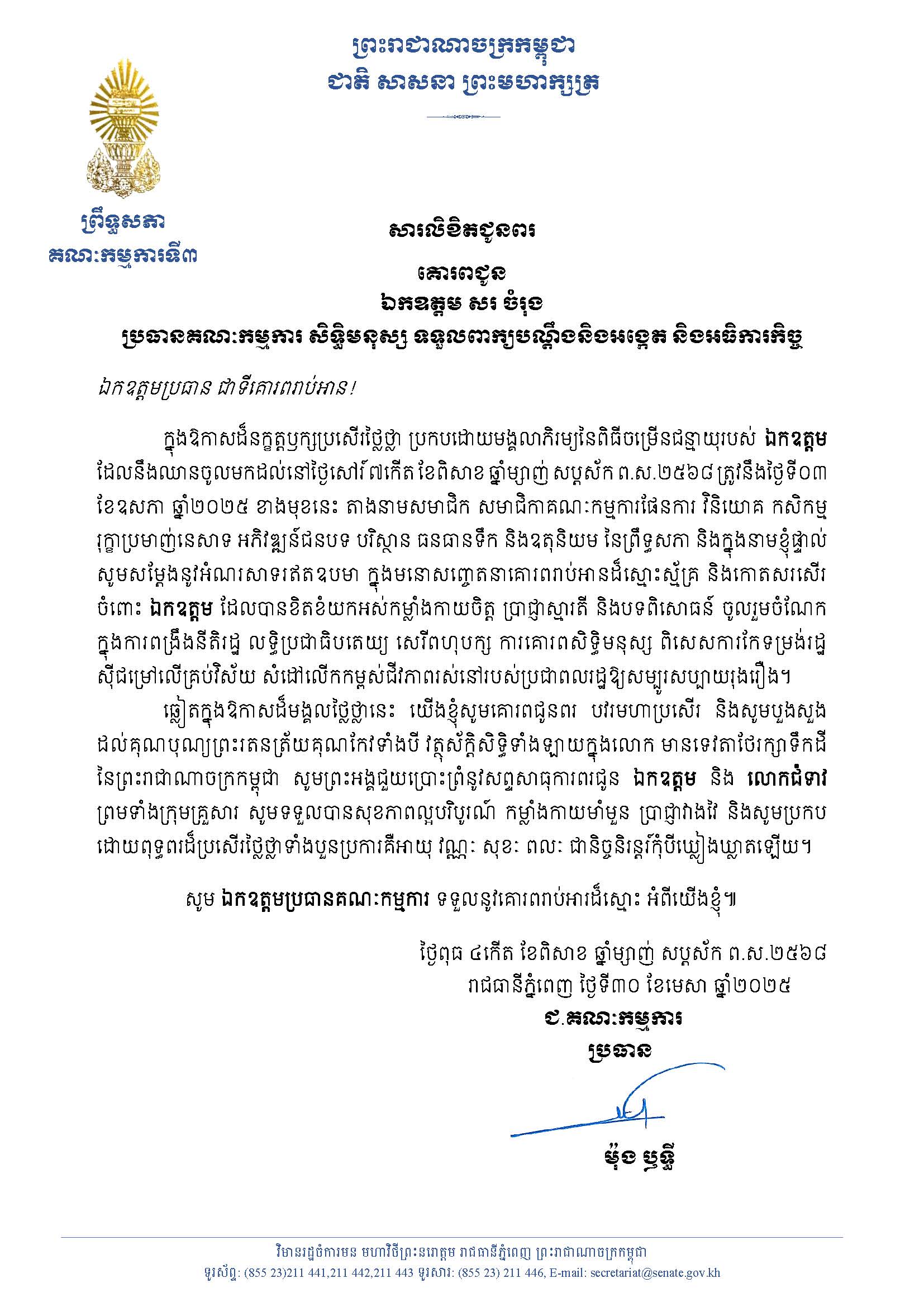 សារលិខិតជូនពរ របស់ ឯកឧត្តមបណ្ឌិត ម៉ុង ឬទ្ធី ប្រធានគណៈកម្មការទី៣ព្រឹទ្ធសភា គោរពជូន ឯកឧត្តម សរ ចំរុង ប្រធានគណៈកម្មការ សិទ្ធិមនុស្ស ទទួលពាក្យបណ្តឹងនិងអង្កេត និងអធិការកិច្ច នៃរដ្ឋសភា ក្នុងឱកាសដ៏នក្ខត្តឫក្សប្រសើរថ្លៃថ្លា ប្រកបដោយមង្គលាភិរម្យនៃពិធីចម្រើនជន្មាយុរបស់ ឯកឧត្តម ដែលនឹងឈានចូលមកដល់នៅថ្ងៃសៅរ៍ ទី០៣ ខែឧសភា ឆ្នាំ២០២៥ ខាងមុខនេះ
