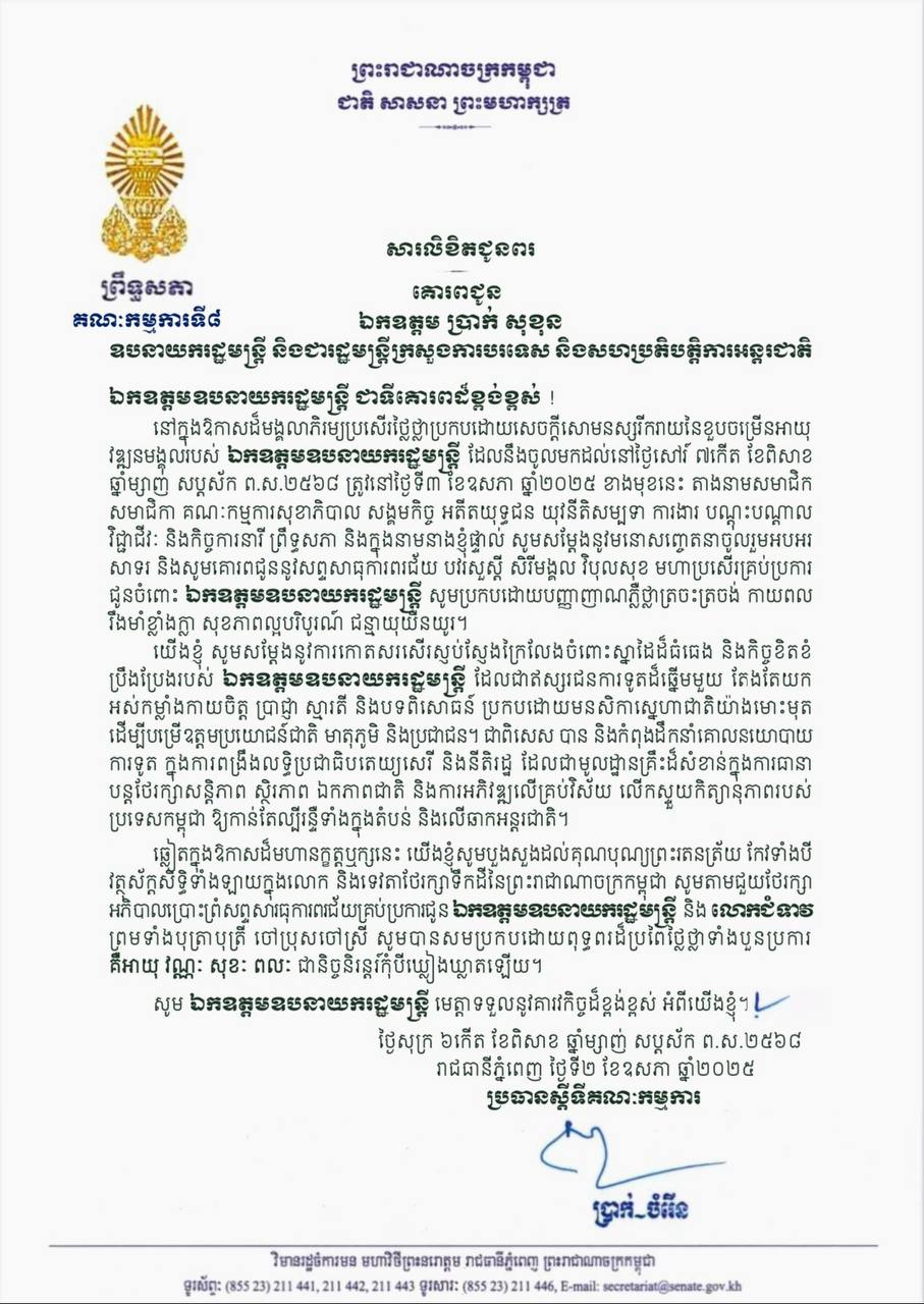 សារលិខិតជូនពរ របស់ ឯកឧត្តម ប្រាក់ ចំរើន ប្រធានស្តីទីគណៈកម្មការទី៨ព្រឹទ្ធសភា គោរពជូន ឯកឧត្តម ប្រាក់ សុខុន ឧបនាយករដ្ឋមន្ត្រី រដ្ឋមន្ត្រីក្រសួងការបរទេស និងសហប្រតិបត្តិការអន្តរជាតិ ក្នុងឱកាសដ៏នក្ខត្តឫក្សប្រសើរថ្លៃថ្លា ប្រកបដោយមង្គលាភិរម្យនៃពិធីចម្រើនជន្មាយុរបស់ ឯកឧត្តម ឧបនាយករដ្ឋមន្ត្រី ដែលនឹងឈានចូលមកដល់នៅថ្ងៃសៅរ៍ ទី០៣ ខែឧសភា ឆ្នាំ២០២៥ ខាងមុខនេះ