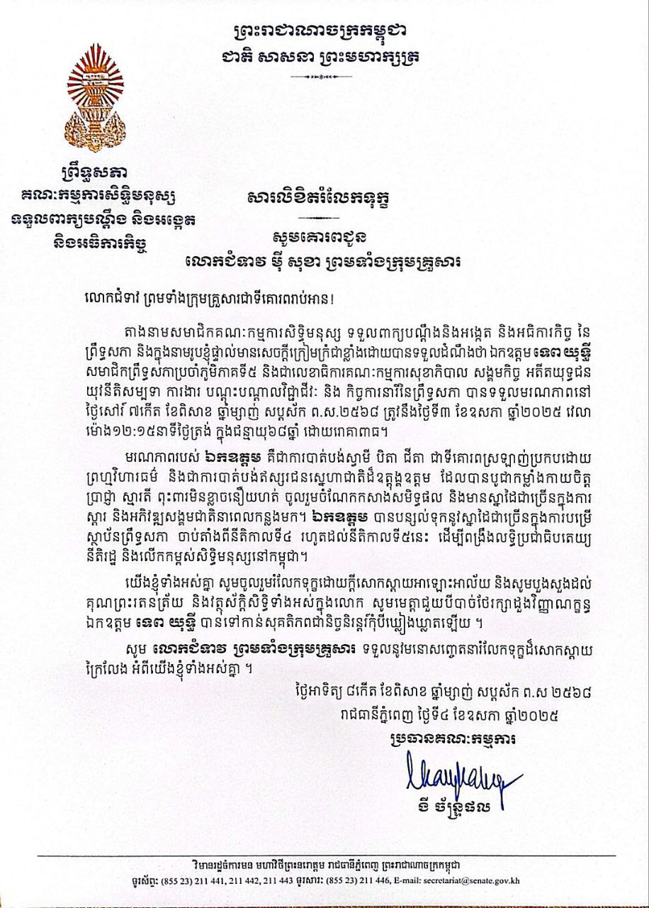 លិខិតរំលែកទុក្ខរបស់គណៈកម្មការទី១ ព្រឹទ្ធសភា ជូនចំពោះលោកជំទាវ ម៉ី សុខា ព្រមទាំងក្រុមគ្រួសារ