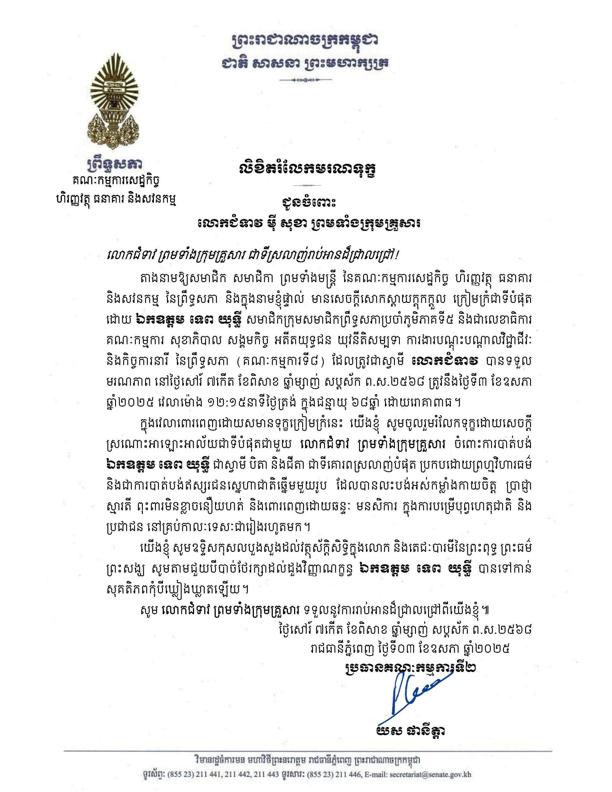 • លិខិតរំលែកទុក្ខរបស់គណៈកម្មការទី២ ព្រឹទ្ធសភា ជូនចំពោះលោកជំទាវ ម៉ី សុខា ព្រមទាំងក្រុមគ្រួសារ