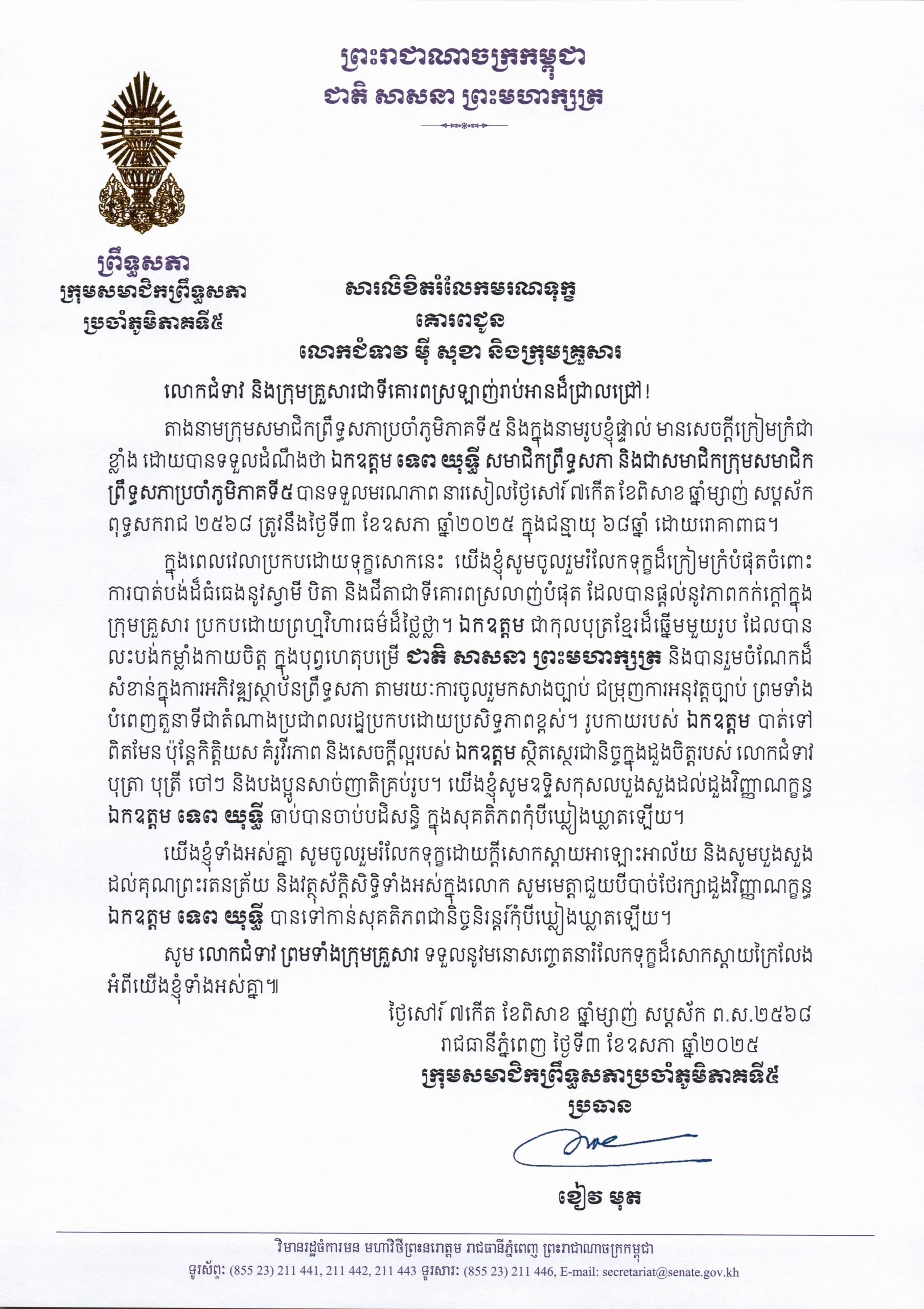 លិខិតរំលែកទុក្ខរបស់ក្រុមសមាជិកព្រឹទ្ធសភាប្រចាំភូមិភាគទី៥ ជូនចំពោះលោកជំទាវ ម៉ី សុខា ព្រមទាំងក្រុមគ្រួសារ
