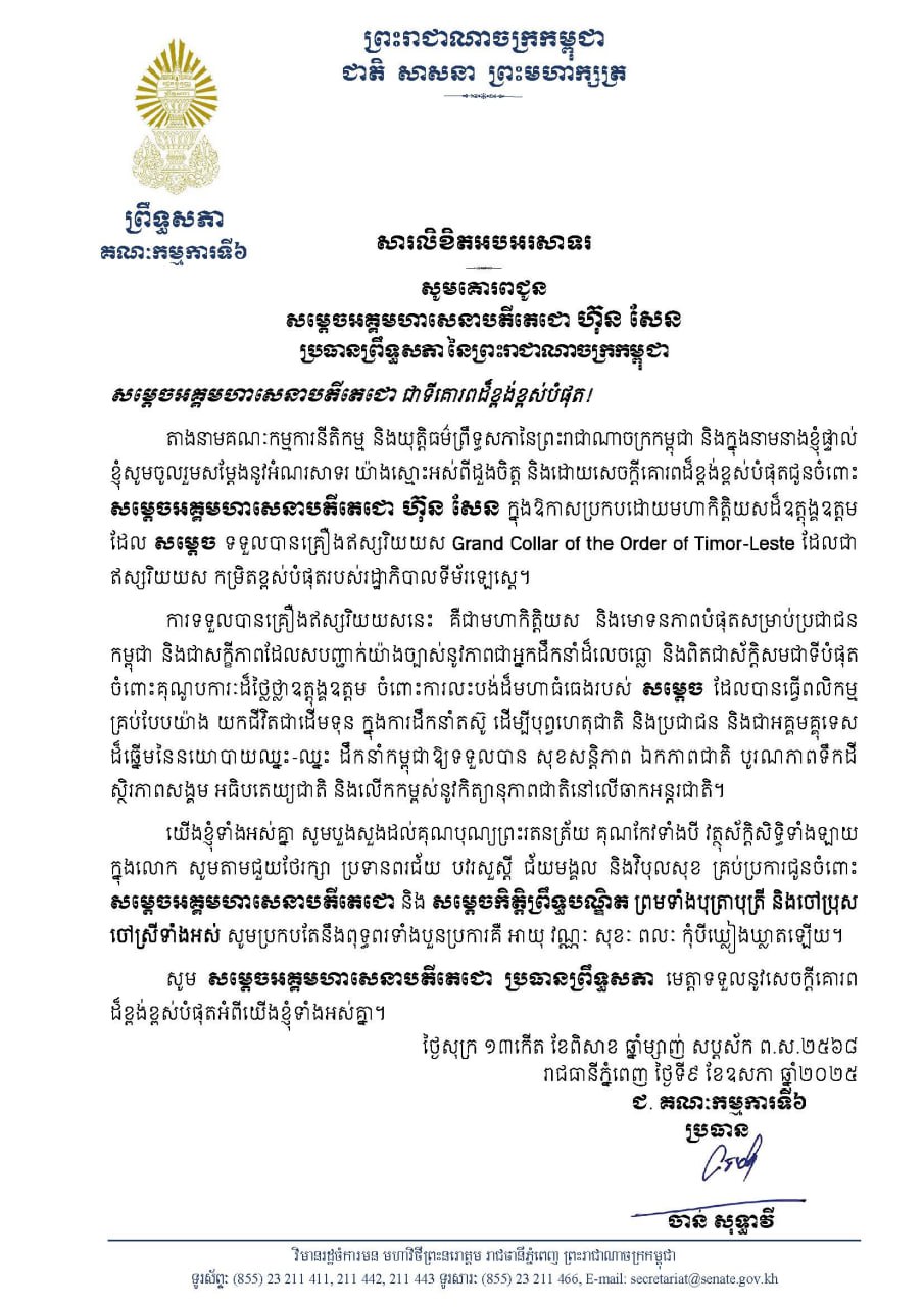 • លិខិតអបអរសាទររបស់គណៈកម្មការទី៦ ព្រឹទ្ធសភា គោរពជូន​សម្តេចអគ្គមហាសេនាបតីតេជោ ហ៊ុន សែន ប្រធានព្រឹទ្ធសភានៃព្រះរាជាណាចក្រកម្ពុជា ក្នុងឱកាសដែលសម្តេចទទួលបានគ្រឿងឥស្សរិយយស Grand Collar of the Order of Timor-Leste ដែលជាគ្រឿងឥស្សរិយយសកម្រិតខ្ពស់បំផុតពីសំណាក់ ឯកឧត្តម José Ramos-Horta ប្រធានាធិបតី នៃសាធារណរដ្ឋប្រជាធិបតេយ្យទីម័រឡេស្តេ