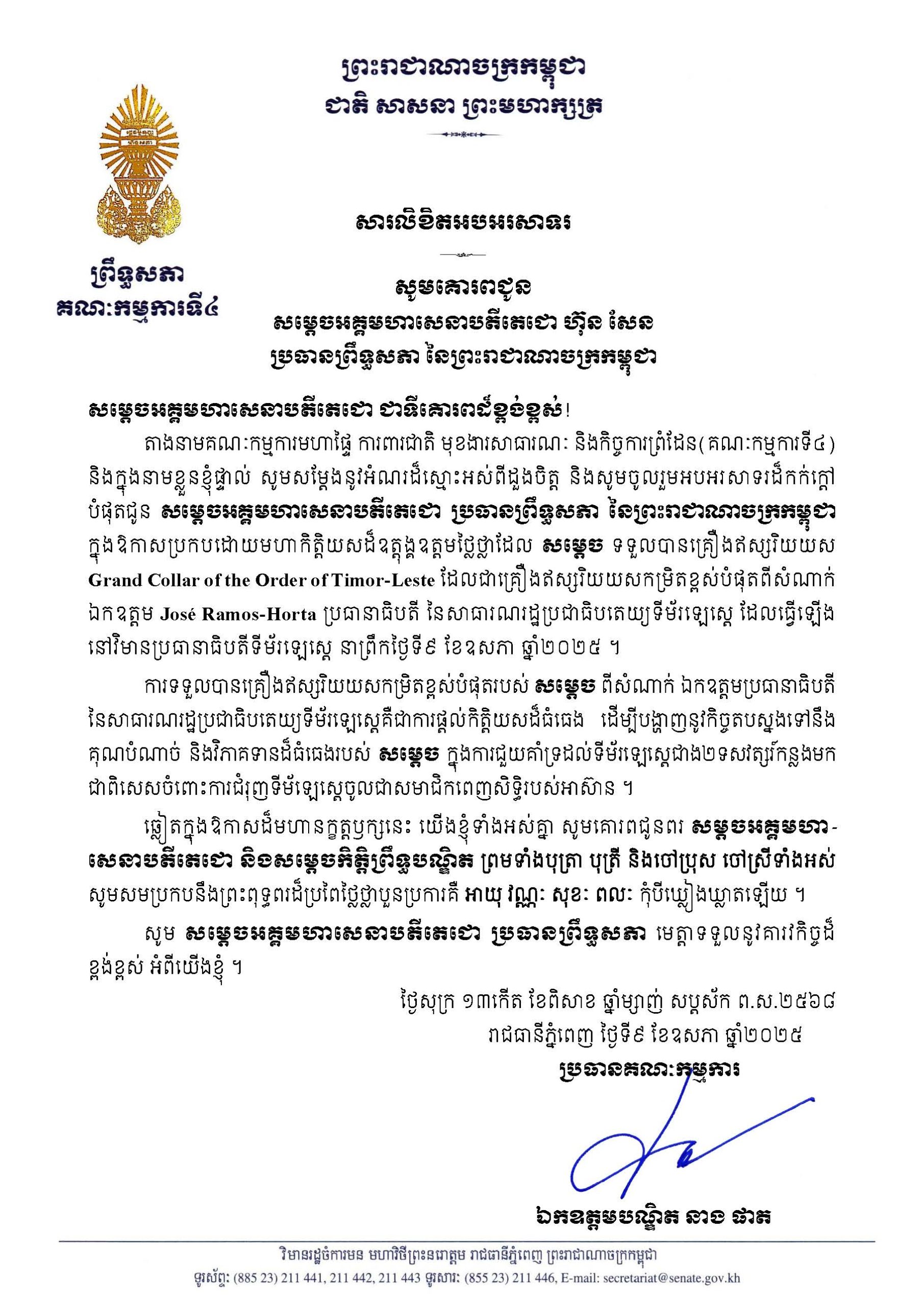 លិខិតអបអរសាទររបស់គណៈកម្មការទី៤ ព្រឹទ្ធសភា គោរពជូនសម្តេចអគ្គមហាសេនាបតីតេជោ ហ៊ុន សែន ប្រធានព្រឹទ្ធសភានៃព្រះរាជាណាចក្រកម្ពុជា ក្នុងឱកាសដែលសម្តេចទទួលបានគ្រឿងឥស្សរិយយស Grand Collar of the Order of Timor-Leste ដែលជាគ្រឿងឥស្សរិយយសកម្រិតខ្ពស់បំផុតពីសំណាក់ ឯកឧត្តម José Ramos-Horta ប្រធានាធិបតី នៃសាធារណរដ្ឋប្រជាធិបតេយ្យទីម័រឡេស្តេ