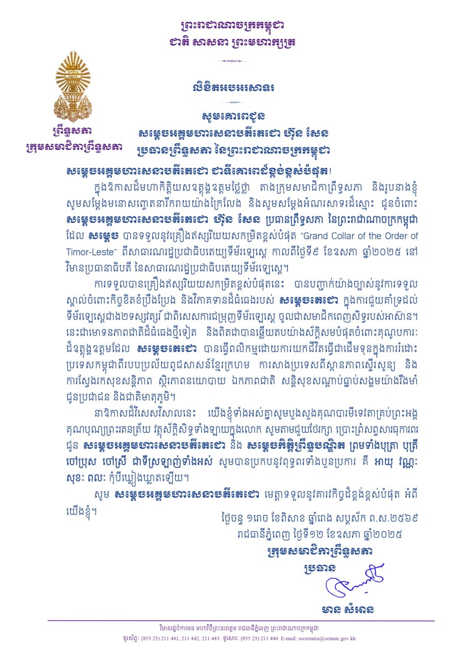 • លិខិតអបអរសាទរ របស់ ក្រុមសមាជិកាព្រឹទ្ធសភា សូមគោរពជូន​ សម្តេចអគ្គមហាសេនាបតីតេជោ ហ៊ុន សែន ប្រធានព្រឹទ្ធសភា នៃព្រះរាជាណាចក្រកម្ពុជា ក្នុងឱកាសដែលសម្តេចទទួលបានគ្រឿងឥស្សរិយយស Grand Collar of the Order of Timor-Leste ដែលជាគ្រឿងឥស្សរិយយសកម្រិតខ្ពស់បំផុតពីសំណាក់ ឯកឧត្តម José Ramos-Horta ប្រធានាធិបតី នៃសាធារណរដ្ឋប្រជាធិបតេយ្យទីម័រឡេស្តេ