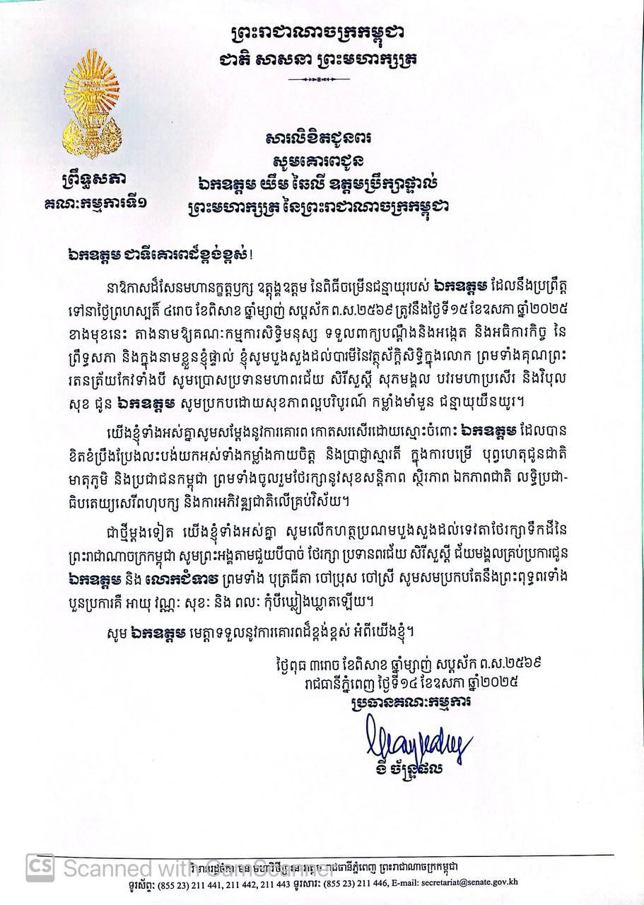 សារលិខិតជូនពររបស់គណៈកម្មការទី១ ព្រឹទ្ធសភា គោរពជូនឯកឧត្តម យឹម ឆៃលី ឧត្តមប្រឹក្សាផ្ទាល់ព្រះមហាក្សត្រនៃព្រះរាជាណាចក្រកម្ពុជា ក្នុងឱកាសសិរីមង្គលនៃថ្ងៃខួបចម្រើនជន្មាយុរបស់ឯកឧត្តម នាថ្ងៃទី១៥ ខែឧសភា ឆ្នាំ ២០២៥
