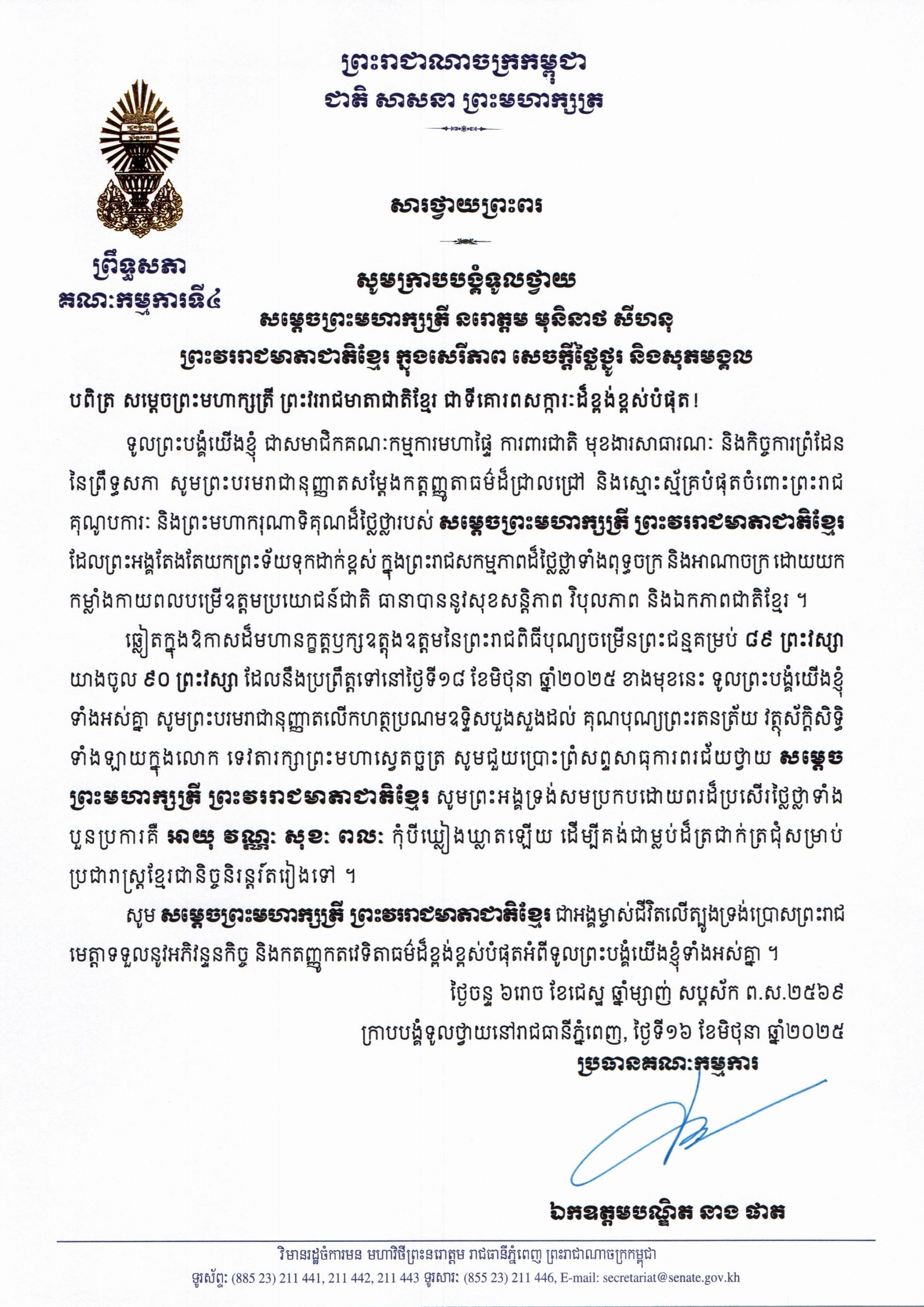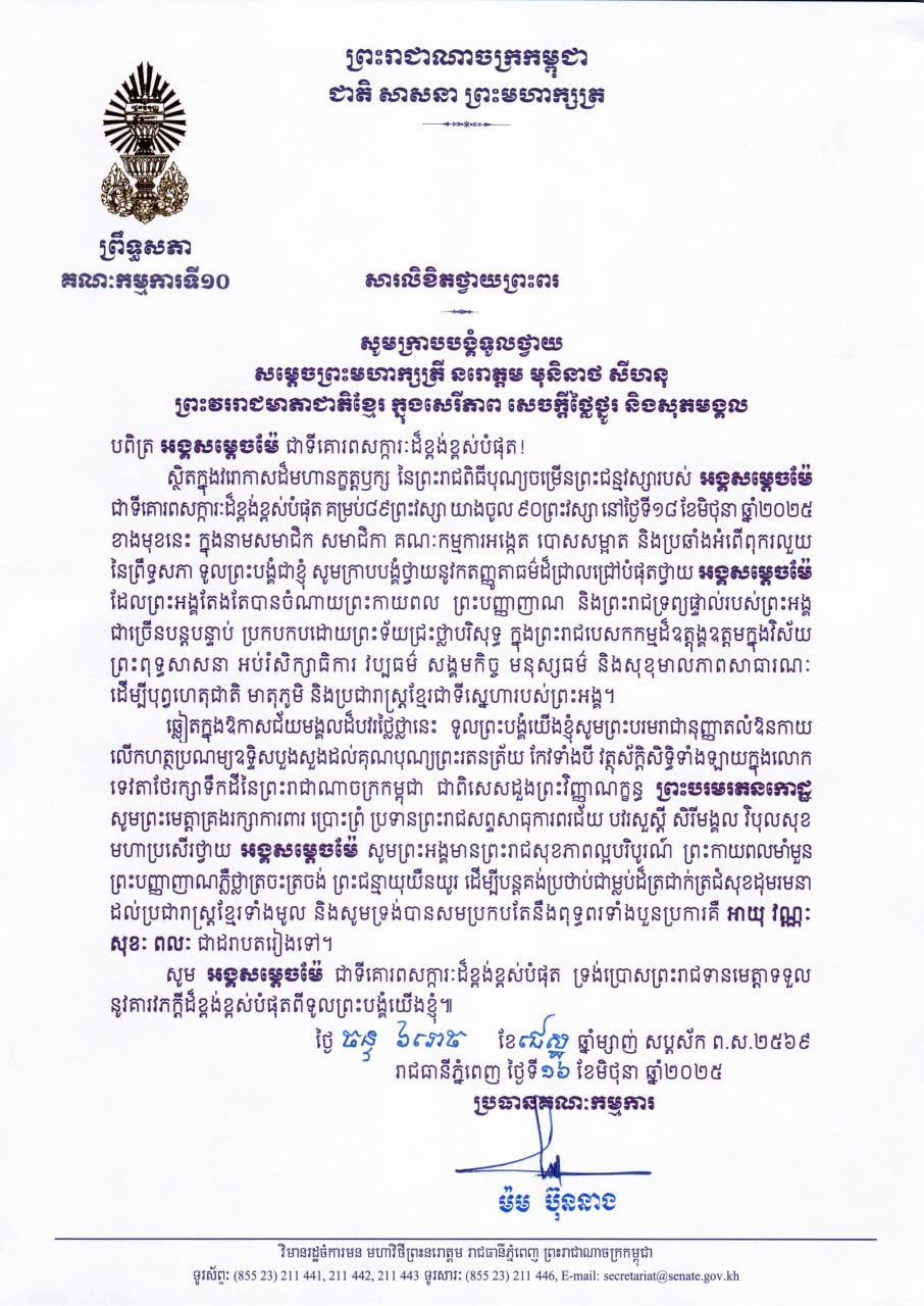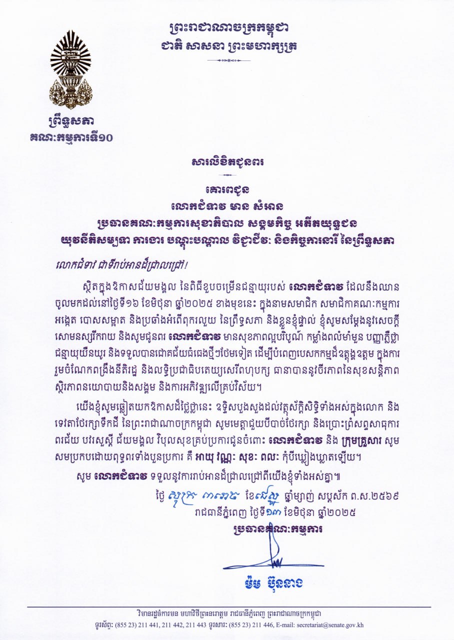 សារលិខិតជូនពររបស់ឯកឧត្តម​ ឡាយ សំកុល​ អគ្គលេខាធិការ​ព្រឹទ្ធសភា​ គោរពជូន សម្តេចកិត្តិព្រឹទ្ធបណ្ឌិត ប៊ុន រ៉ានី ហ៊ុន សែន ប្រធានកាកបាទក្រហមកម្ពុជា ក្នុងឱកាសដ៏ឧត្តុង្គឧត្តមប្រកបដោយក្តីសោមនស្សរីករាយ នៃពិធីចម្រើនជន្មាយុរបស់ សម្តេចកិត្តិព្រឹទ្ធបណ្ឌិត ដែលនឹងប្រព្រឹត្តទៅនៅថ្ងៃទី១៥ ខែធ្នូ ឆ្នាំ២០២៥ ខាងមុខនេះ