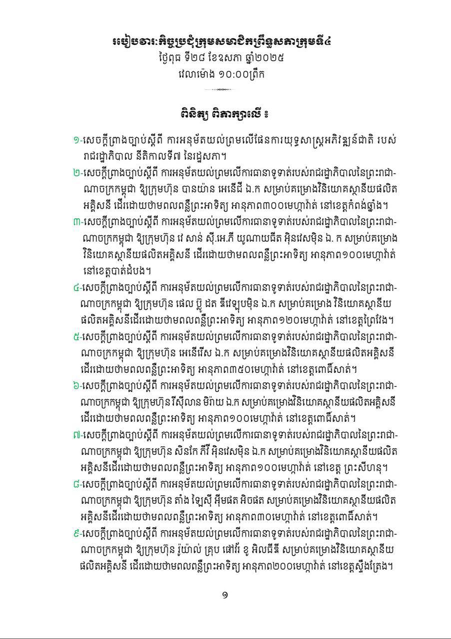 នាព្រឹកថ្ងៃពុធ ទី២៨ ខែឧសភា ឆ្នាំ២០២៥ វេលាម៉ោង ០៩:០០នាទី នៅបន្ទប់ប្រជុំគណៈកម្មការទី៨ព្រឹទ្ធសភា ក្រុមសមាជិកព្រឹទ្ធសភា ក្រុមទី៤ បានរៀបចំកិច្ចប្រជុំផ្ទៃក្នុងក្រុម ក្រោមអធិបតីភាពលោកជំទាវ មាន សំអាន ប្រធានក្រុមសមាជិកព្រឹទ្ធសភា ក្រុមទី៤ ដើម្បីពិនិត្យ ពិភាក្សាលើរបៀបវារៈចំនួន២៧ ដូចមានជូនភ្ជាប់មកជាមួយ…។