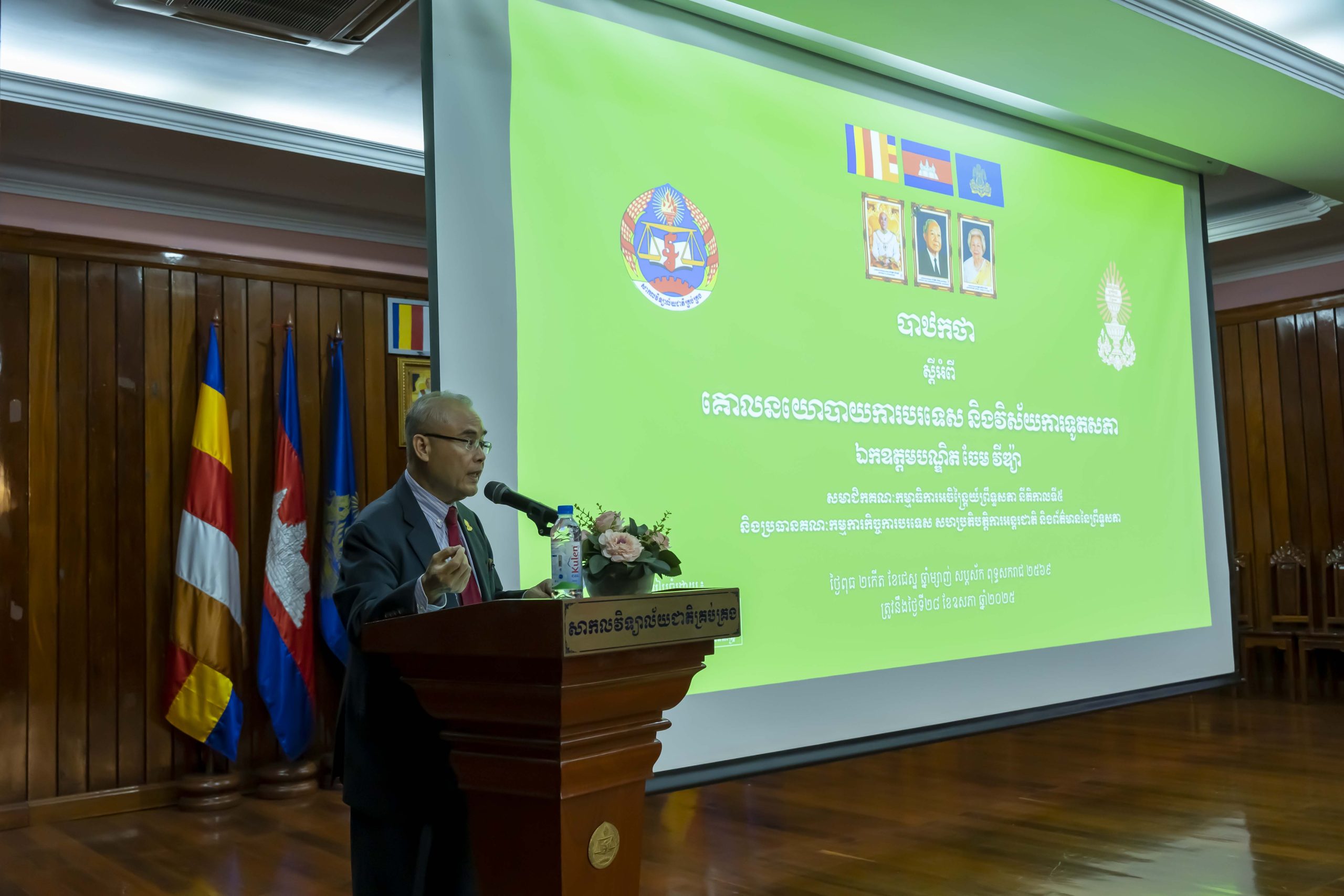 នៅក្នុងកិច្ចថ្លែងបាឋកថានេះ ឯកឧត្ដមសាស្ដ្រាចារ្យបណ្ឌិត បានឡើងមានមតិស្ថាគមន៍ ជម្រាបអំពីសាវតា និងកិច្ចអភិវឌ្ឍន៍របស់សកលវិទ្យាល័យជូនគណៈអធិបតី និងអង្គពិធី។ បន្ទាប់មកទៀត ឯកឧត្ដមបណ្ឌិតប្រធានគណៈកម្មការ បានចាប់ផ្ដើមដោយការបកស្រាយអំពីបរិបទប្រវត្តិសាស្ត្រ ដំណើរការនៃកិច្ចព្រមព្រៀងសន្តិភាពទាំងឡាយ និងវឌ្ឍនភាពការងារការទូតរបស់ព្រឹទ្ធសភានៃព្រះរាជាណាចក្រកម្ពុជា នីតិកាលទី៥ ក្រោមការដឹកនាំដ៏ខ្ពង់ខ្ពស់បំផុត ប្រកបដោយភាពឈ្លាសវៃ ស្វាហាប់ និងកិត្តិបណ្ឌិតរបស់ សម្ដេចអគ្គមហាសេនាបតីតេជោ ហ៊ុន សែន ប្រធានព្រឹទ្ធសភា។ ជាកិច្ចបញ្ចប់ ឯកឧត្ដមបណ្ឌិត ចែម វីឌ្យ៉ា បានធ្វើការចែករំលែកអំពីការងារការទូត និងភាពជាអ្នកដឹកនាំ ដោយផ្អែកលើបទពិសោធន៍ការងារក្នុងវិស័យការទូតដ៏ឧត្ដុង្គឧត្ដមជាច្រើនឆ្នាំ។