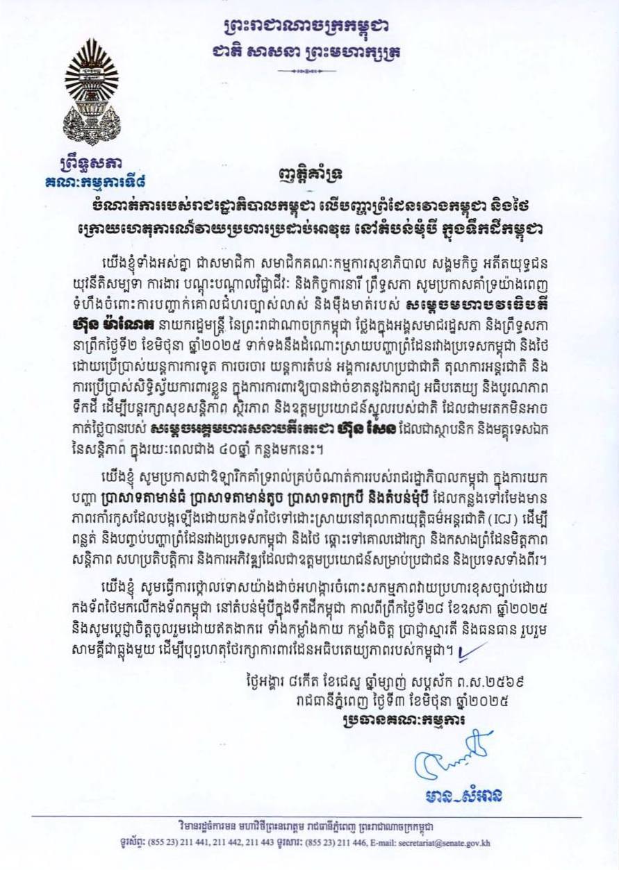 ញត្តិគាំទ្រ របស់ គណៈកម្មការទី៨ព្រឹទ្ធសភា ចំពោះចំណាត់ការរបស់រាជរដ្ឋាភិបាលកម្ពុជា លើបញ្ហាព្រំដែនរវាងកម្ពុជា និងថៃ ក្រោយហេតុការណ៍វាយប្រហារប្រដាប់អាវុធ នៅតំបន់មុំបី ក្នុងទឹកដីកម្ពុជា