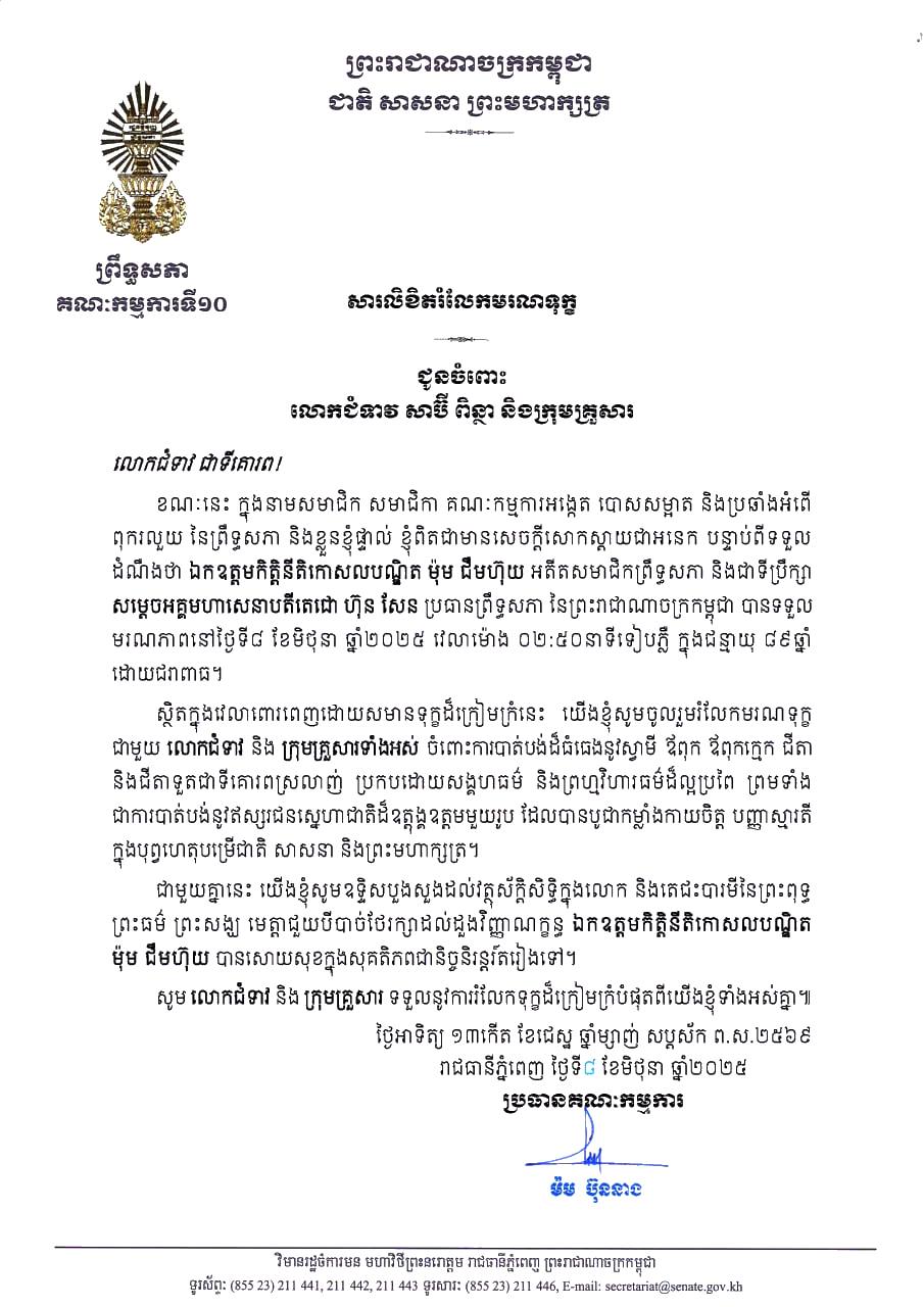 • សារលិខិតរំលែកទុក្ខ របស់ គណៈកម្មការទី១០ ព្រឹទ្ធសភា ជូនចំពោះ លោកជំទាវ សាប៊ី ពិន្ថា ព្រមទាំងក្រុមគ្រួសារ ចំពោះមរណភាពរបស់ឯកឧត្តមកិត្តិនីតិកោសលបណ្ឌិត ម៉ុម ជឹមហ៊ុយ អតីតសមាជិកព្រឹទ្ធសភា និងជាទីប្រឹក្សាសម្តេចអគ្គមហាសេនាបតីតេជោ ហ៊ុន សែន ប្រធានព្រឹទ្ធសភា