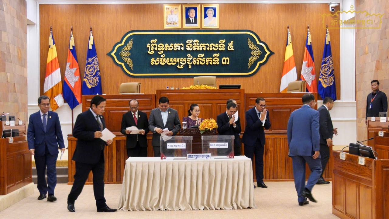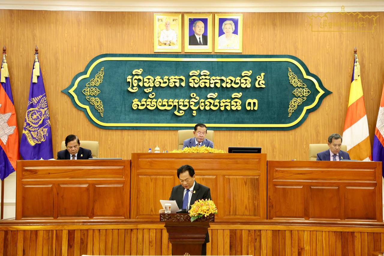 នារសៀលថ្ងៃចន្ទ ទី១៦ ខែមិថុនា ឆ្នាំ២០២៥ វេលាម៉ោង១៨:០០នាទី ព្រឹទ្ធសភានៃព្រះរាជាណាចក្រកម្ពុជា បានបន្តសម័យប្រជុំលើកទី៣ ព្រឹទ្ធសភានីតិកាលទី៥ ក្រោមអធិបតីភាពដ៏ខ្ពង់ខ្ពស់របស់សម្តេចអគ្គមហាសេនាបតីតេជោ ហ៊ុន សែន ប្រធានព្រឹទ្ធសភា ដោយមានវត្តមានសមាជិកព្រឹទ្ធសភាចូលរួម ចំនួន ៦០រូប។ នៅរសៀលនេះ អង្គប្រជុំបានបន្តដំណើរការទៅតាមរបៀបវារៈ ដូចខាងក្រោម៖ ១-ពិនិត្យហើយឱ្យយោបល់លើសេចក្តីព្រាងច្បាប់ស្តីពីជលផល។ សេចក្តីព្រាងច្បាប់នេះ ត្រូវបានឯកឧត្តមបណ្ឌិត ម៉ង់ ឫទ្ធី ប្រធានគណៈកម្មការផែនការ វិនិយោគ កសិកម្ម រុក្ខាប្រមាញ់ នេសាទ អភិវឌ្ឍន៍ជនបទ បរិស្ថាន ធនធានទឹក និងឧតុនិយម នៃព្រឹទ្ធសភា ឡើងរាយការណ៍ជូនអង្គប្រជុំអំពី លទ្ធផលនៃការពិនិត្យសិក្សាលើសេចក្តីព្រាងច្បាប់។ សមាជិកព្រឹទ្ធសភាចំនួន៦រូប បានឡើងមានយោបល់ និងមានការឆ្លើយបំភ្លឺជូនអង្គប្រជុំ ពីឯកឧត្តម ឌិត ទីណា រដ្ឋមន្ត្រីក្រសួងកសិកម្ម រុក្ខាប្រមាញ់ និងនេសាទ។ អង្គប្រជុំបានពិនិត្យហើយឱ្យយោបល់ឯកភាពទាំងស្រុងលើសេចក្តីព្រាងច្បាប់ទាំងមូល ដោយឥតកែប្រែចំនួន ៦០សំឡេង នៃចំនួនសមាជិកព្រឹទ្ធសភាទាំងមូល។ ២-បោះឆ្នោតជ្រើសរើសបំពេញសមាជិកគណៈកម្មការមហាផ្ទៃ ការពារជាតិ មុខងារសាធារណៈ និងកិច្ចការព្រំដែន នៃព្រឹទ្ធសភា និងគណៈកម្មការ សុខាភិបាល សង្គមកិច្ច អតីតយុទ្ធជន យុវនីតិសម្បទា ការងារ បណ្តុះបណ្តាល វិជ្ជាជីវៈ និងកិច្ចការនារី នៃព្រឹទ្ធសភា។ លោកជំទាវ ចឹក ហេង សមាជិកាព្រឹទ្ធសភា ត្រូវបានសម័យប្រជុំលើកទី៣ ព្រឹទ្ធសភានីតិកាលទី៥ បោះឆ្នោតជ្រើសរើសជាសមាជិកាគណៈកម្មការមហាផ្ទៃ ការពារជាតិ មុខងារ សាធារណៈ និងកិច្ចការព្រំដែន នៃព្រឹទ្ធសភា (គណៈកម្មការទី៤) ដោយទទួលបានសំឡេងគាំទ្រចំនួន ៦០សំឡេង នៃចំនួនសមាជិកព្រឹទ្ធសភាទាំងមូល។ ឯកឧត្តម អ៊ុន វណ្ណា សមាជិកព្រឹទ្ធសភា ត្រូវបានសម័យប្រជុំលើកទី៣ ព្រឹទ្ធសភានីតិកាលទី៥ បោះឆ្នោតជ្រើសរើសជាសមាជិកគណៈកម្មការសុខាភិបាល សង្គមកិច្ច អតីតយុទ្ធជន យុវនីតិសម្បទា ការងារ បណ្តុះបណ្តាលវិជ្ជាជីវៈ និងកិច្ចការនារី នៃព្រឹទ្ធសភា (គណៈកម្មការទី៨) ដោយទទួលបានសំឡេងគាំទ្រចំនួន ៦០សំឡេង នៃចំនួនសមាជិកព្រឹទ្ធសភាទាំងមូល។ អង្គប្រជុំបានបញ្ចប់នៅម៉ោង ១៦:០០នាទី នាថ្ងៃខែឆ្នាំដដែល៕