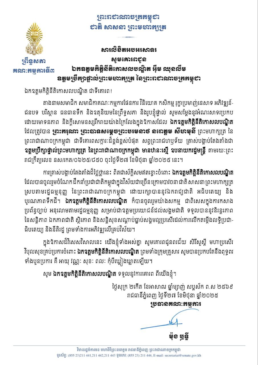 សារលិខិតអបអរសាទររបស់ឯកឧត្តមបណ្ឌិត ម៉ុង ឫទ្ធី ប្រធានគណៈកម្មការទី៣ព្រឹទ្ធសភា គោរពជូនឯកឧត្តមកិត្តិនីតិកោសលបណ្ឌិត អ៉ឹម ឈុនលឹម ក្នុងឱកាសដែល ឯកឧត្តមកិត្តិនីតិកោសលបណ្ឌិត ត្រូវបាន ព្រះករុណា ព្រះបាទសម្តេចព្រះបរមនាថ នរោត្តម សីហមុនី ព្រះមហាក្សត្រ នៃ ព្រះរាជាណាចក្រកម្ពុជា ជាទីគោរពសក្ការៈដ៏ខ្ពង់ខ្ពស់បំផុត សព្វព្រះរាជហឫទ័យ ត្រាស់បង្គាប់តែងតាំងជា «ឧត្តមប្រឹក្សាផ្ទាល់ព្រះមហាក្សត្រ នៃព្រះរាជាណាចក្រកម្ពុជា»