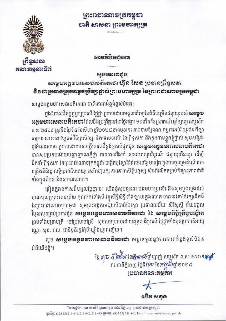 សារលិខិតជូនពររបស់ឯកឧត្តម ឈិត សុខុន ប្រធានគណៈកម្មការទី៧ព្រឹទ្ធសភា គោរពជូនសម្តេចអគ្គមហាសេនាបតីតេជោ ហ៊ុន សែន ប្រធានព្រឹទ្ធសភា និងជាប្រធានក្រុមឧត្តមប្រឹក្សាផ្ទាល់ព្រះមហាក្សត្រ នៃព្រះរាជាណាចក្រកម្ពុជា ក្នុងឱកាសដ៏នក្ខត្តឫក្សប្រសើរថ្លៃថ្លា ប្រកបដោយមង្គលាភិរម្យនៃពិធីចម្រើនជន្មាយុរបស់សម្តេចអគ្គមហាសេនាបតីតេជា ដែលនឹងប្រព្រឹត្តទៅនាថ្ងៃអង្គារ ទី៥ ខែសីហា ឆ្នាំ២០២៥ ខាងមុខនេះ