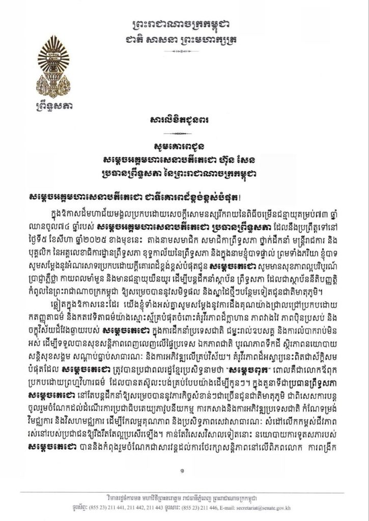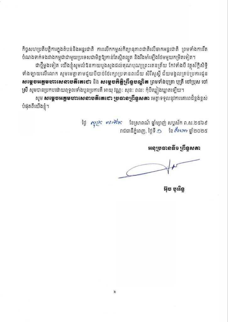 សារលិខិតជូនពររបស់ឯកឧត្តម អ៊ុច បូររិទ្ធ អនុប្រធានទី១ព្រឹទ្ធសភា គោរពជូនសម្តេចអគ្គមហាសេនាបតីតេជោ ហ៊ុន សែន ប្រធានព្រឹទ្ធសភា នៃព្រះរាជាណាចក្រកម្ពុជា ក្នុងឱកាសដ៏មហាជ័យមង្គលប្រកបដោយសេចក្តីសោមនស្សរីករាយនៃពិធីចម្រើនជន្មាយុគម្រប់៧៣ឆ្នាំ ឈានចូល៧៤ឆ្នាំ របស់ សម្តេចអគ្គមហាសេនាបតីតេជោ ប្រធានព្រឹទ្ធសភា ដែលនឹងប្រព្រឹត្តទៅនៅ ថ្ងៃទី៥ ខែសីហា ឆ្នាំ២០២៥ ខាងមុខនេះ