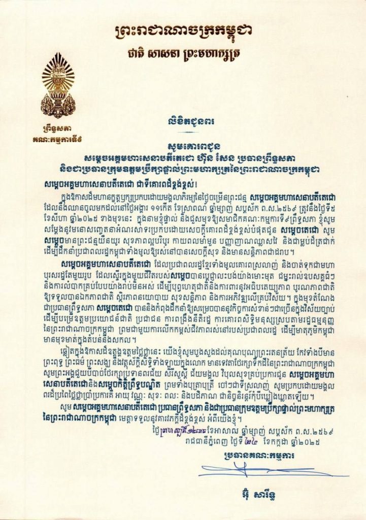 លិខិតជូនពររបស់ឯកឧត្តម អ៊ុំ សារឹទ្ធ ប្រធានគណៈកម្មការទី៩ព្រឹទ្ធសភា គោរពជូនសម្តេចអគ្គមហាសេនាបតីតេជោ ហ៊ុន សែន ប្រធានព្រឹទ្ធសភា និងជាប្រធានក្រុមឧត្តមប្រឹក្សាផ្ទាល់ព្រះមហាក្សត្រនៃព្រះរាជាណាចក្រកម្ពុជា ក្នុងឱកាសដ៏មហានក្ខត្តឫក្សប្រកបដោយមង្គលាភិរម្យនៃថ្ងៃចម្រើនព្រះជន្ម សម្តេចអគ្គមហាសេនាបតីតេជោ ដែលនឹងឈានចូលមកដល់នៅថ្ងៃអង្គារ ទី៥ ខែសីហា ឆ្នាំ២០២៥ ខាងមុខនេះ