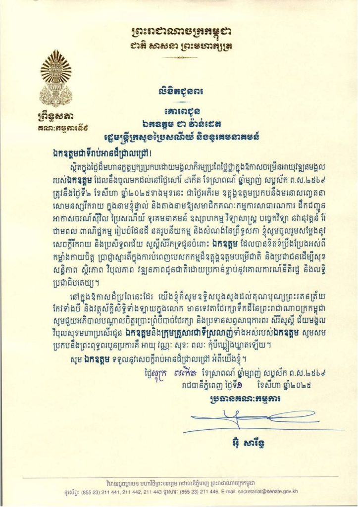 លិខិតជូនពររបស់ឯកឧត្តម អ៊ុ សារឹទ្ធ ប្រធានគណៈកម្មការទី៩ព្រឹទ្ធសភា គោរពជូនឯកឧត្តម ជា វ៉ាន់ដេត រដ្ឋមន្ត្រីក្រសួងប្រៃសណីយ៍ និងទូរគមនាគមន៍ ក្នុងថ្ងៃដ៏មហានក្ខត្តឫក្សប្រកបដោយមង្គលាភិរម្យប្រពៃថ្លៃថ្លាក្នុងឱកាសចម្រើនអាយុវឌ្ឍនមង្គលរបស់ឯកឧត្តម ដែលនឹងចូលមកដល់នៅថ្ងៃសៅរ៍ ទី២ ខែសីហា ឆ្នាំ២០២៥ខាងមុខនេះ