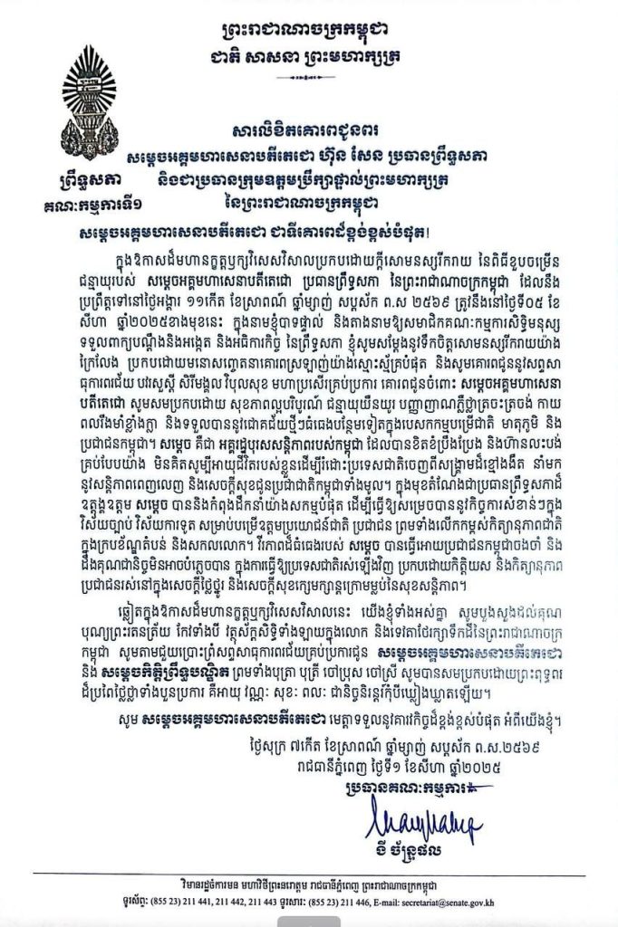 សារលិខិតគោរពជូនពររបស់ឯកឧត្តម ងី ច័ន្រ្ទផល ប្រធានគណៈកម្មការទី១ព្រឹទ្ធសភា គោរពជូនសម្តេចអគ្គមហាសេនាបតីតេជោ ហ៊ុន សែន ប្រធានព្រឹទ្ធសភា និងជាប្រធានក្រុមឧត្តមប្រឹក្សាផ្ទាល់ព្រះមហាក្សត្រ នៃព្រះរាជាណាចក្រកម្ពុជា ក្នុងឱកាសដ៏មហានក្ខត្តឫក្សវិសេសវិសាលប្រកបដោយក្តីសោមនស្សរីករាយ នៃពិធីខួបចម្រើនជន្មាយុរបស់ សម្តេចអគ្គមហាសេនាបតីតេជោ ប្រធានព្រឹទ្ធសភា នៃព្រះរាជាណាចក្រកម្ពុជា ដែលនឹងប្រព្រឹត្តទៅនៅថ្ងៃអង្គារ ទី៥ ខែ សីហា ឆ្នាំ២០២៥ខាងមុខនេះ