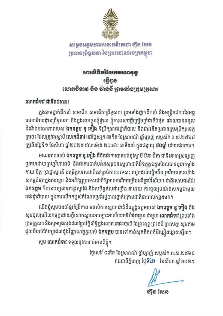 • លិខិតរំលែកមរណទុក្ខរបស់សម្តេចតេជោ ផ្ញើជូនលោកជំទាវ ងិង វ៉ាន់នី ចំពោះមរណភាព របស់ ឯកឧត្តម នូ ភឿងទីប្រឹក្សារាជរដ្ឋាភិបាល និងជាអតីតប្រធានក្រុមប្រឹក្សាខេត្តក្រចេះ ដែលត្រូវជាស្វាមី លោកជំទាវ នៅថ្ងៃសុក្រ ទី១ ខែសីហា ឆ្នាំ២០២៥  ក្នុងជន្មាយុ ៨០ឆ្នាំ ដោយជរាពាធ