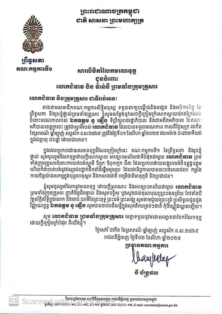សារលិខិតរំលែកមរណទុក្ខរបស់ឯកឧត្តម ងី ច័ន្រ្ទផល ប្រធានគណៈកម្មការទី១ព្រឹទ្ធសភា ជូនលោកជំទាវ ងិន វ៉ាន់នី ព្រមទាំងក្រុមគ្រួសារ ចំពោះមរណភាពរបស់ ឯកឧត្តម នូ ភឿង ទីប្រឹក្សារាជរដ្ឋាភិបាល និងជាអតីតអភិបាល នៃគណៈ អភិបាលខេត្តក្រចេះ ត្រូវជាស្វាមីរបស់ លោកជំទាវ ដែលបានទទួលមរណភាពកាលពីថ្ងៃសុក្រ ទី០១ ខែសីហា ឆ្នាំ២០២៥ វេលាម៉ោង ៨:៤២នាទីយប់ ក្នុងជន្មាយុ ៨០ឆ្នាំ ដោយជរាពាធ