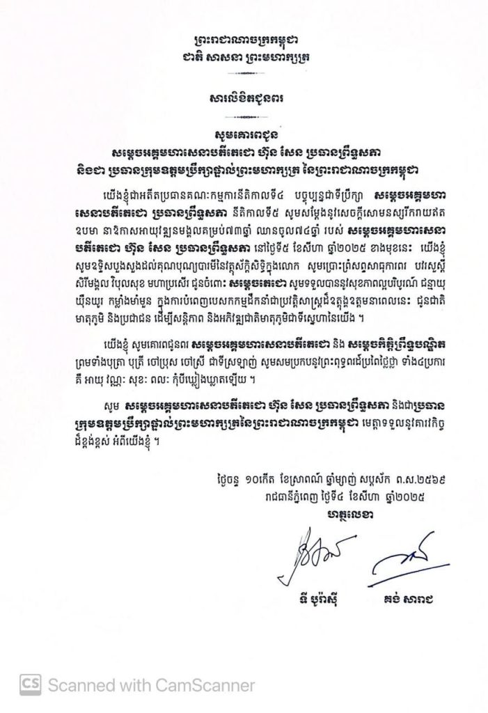 សារលិខិតជូនពររបស់លោកជំទាវកិត្តិនីតិកោសលបណ្ឌិត ទី បូរ៉ាស៊ី និង ឯកឧត្ដម គង់ សារាជ ទីប្រឹក្សាសម្ដេចអគ្គមហាសេនាបតីតេជោ ហ៊ុន សែន ប្រធានព្រឹទ្ធសភា គោរពជូន សម្តេចអគ្គមហាសេនាបតីតេជោ ហ៊ុន សែន ប្រធានព្រឹទ្ធសភា នៃព្រះរាជាណាចក្រកម្ពុជា ក្នុងឱកាសដ៏មហាជ័យមង្គលក្នុងពិធីចម្រើនជន្មាយុគម្រប់ ៧៣ឆ្នាំ ឈានចូល ៧៤ឆ្នាំ របស់សម្តេចអគ្គមហាសេនាបតីតេជោ ប្រធានព្រឹទ្ធសភា នៅថ្ងៃទី៥ ខែសីហា ឆ្នាំ២០២៥ ខាងមុខនេះ