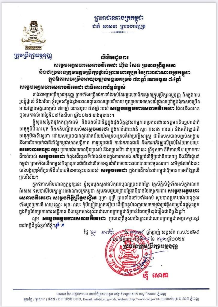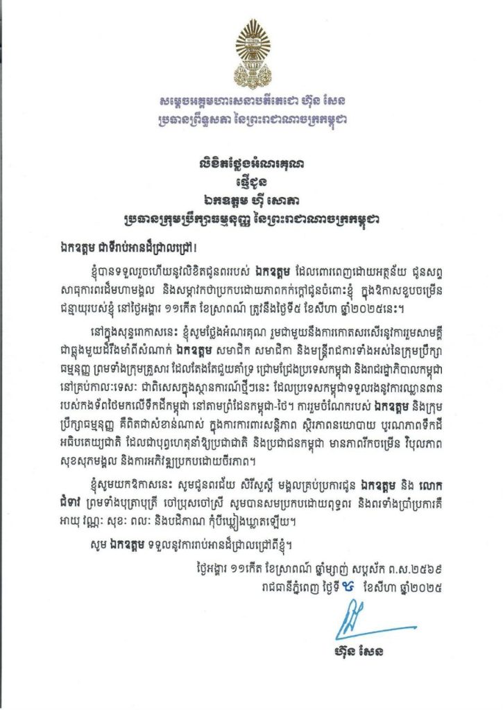 លិខិតថ្លែងអំណរគុណរបស់សម្តេចអគ្គមហាសេនាបតីតេជោ ហ៊ុន សែន ប្រធានព្រឹទ្ធសភា នៃព្រះរាជាណាចក្រកម្ពុជា ជូនឯកឧត្តម ហ៊ី សោភា ប្រធានក្រុមប្រឹក្សាធម្មនុញ្ញ នៃព្រះរាជាណាចក្រកម្ពុជា ដែលឯកឧត្តមបានជូនលិខិតជូនពរក្នុងឱកាសខួបចម្រើនជន្មាយុរបស់សម្តេចតេជោ នៅថ្ងៃអង្គារ ទី៥ ខែសីហា ឆ្នាំ២០២៥នេះ