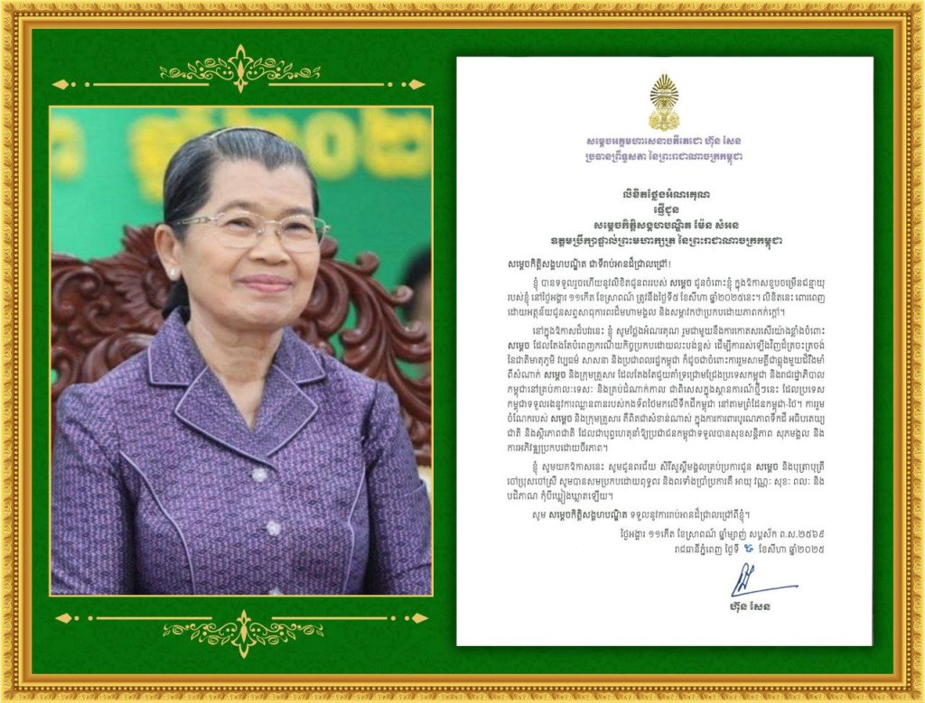 លិខិតថ្លែងអំណរគុណរបស់សម្តេចអគ្គមហាសេនាបតីតេជោ ហ៊ុន សែន ប្រធានព្រឹទ្ធសភា នៃព្រះរាជាណាចក្រកម្ពុជា ជូនសម្តេចកិត្តិសង្គហបណ្ឌិត ម៉ែន សំអន ឧត្តមប្រឹក្សាផ្ទាល់ព្រះមហាក្សត្រ នៃព្រះរាជាណាចក្រកម្ពុជា ដែលសម្តេចកិត្តិសង្គហបណ្ឌិត បានជូនលិខិតជូនពរក្នុងឱកាសខួបចម្រើនជន្មាយុរបស់សម្តេចតេជោ នៅថ្ងៃអង្គារ ទី៥ ខែសីហា ឆ្នាំ២០២៥នេះ