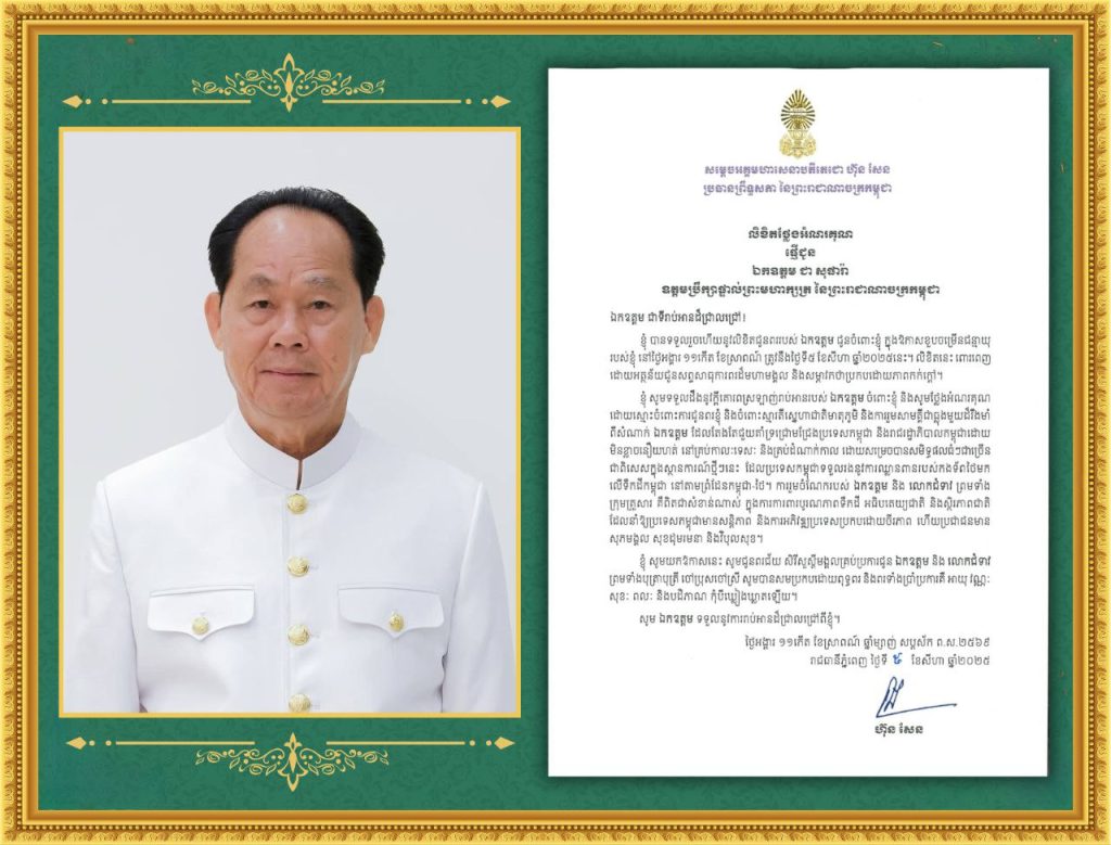 • លិខិតថ្លែងអំណរគុណរបស់សម្តេចអគ្គមហាសេនាបតីតេជោ ហ៊ុន សែន ប្រធានព្រឹទ្ធសភា នៃព្រះរាជាណាចក្រកម្ពុជា ជូនឯកឧត្តម ជា សុផារ៉ា ឧត្តមប្រឹក្សាផ្ទាល់ព្រះមហាក្សត្រ នៃព្រះរាជាណាចក្រកម្ពុជា ដែលឯកឧត្តម បានជូនលិខិតជូនពរក្នុងឱកាសខួបចម្រើនជន្មាយុរបស់សម្តេចតេជោ នៅថ្ងៃអង្គារ ទី៥ ខែសីហា ឆ្នាំ២០២៥នេះ