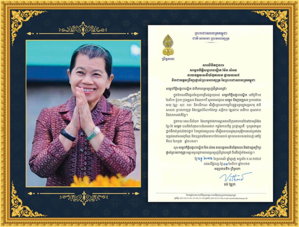 សារលិខិតជូនពររបស់ឯកឧត្តមបណ្ឌិត ធន់ វឌ្ឍនា អនុប្រធានទី២ព្រឹទ្ធសភា គោរពជូនសម្តេចកិត្តិសង្គហបណ្ឌិត ម៉ែន សំអន នាយឧត្តមសេនីយ៍ផុតលេខ ផ្កាយមាស៥ និងជាឧត្តមប្រឹក្សាផ្ទាល់ព្រះមហាក្សត្រ នៃព្រះរាជាណាចក្រកម្ពុជា ក្នុងឱកាសសិរីមង្គលនៃខួបចម្រើនជន្មាយុរបស់ សម្តេចកិត្តិសង្គហបណ្ឌិត នៅថ្ងៃទី១៥ ខែសីហា ឆ្នាំ២០២៥