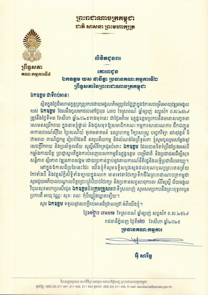 • លិខិតជូនពររបស់ឯកឧត្តម អ៊ុំ សារឹទ្ធ ប្រធានគណៈកម្មការ​ទី៩ព្រឹទ្ធសភា​ គោរពជូនឯកឧត្តម យស ផានីត្តា ប្រធានគណៈកម្មការទី២ព្រឹទ្ធសភា នៃព្រះរាជាណាចក្រកម្ពុជា ក្នុងថ្ងៃដ៏មហានក្ខត្តឫក្សប្រកបដោយមង្គលាភិរម្យប្រពៃថ្លៃថ្លាក្នុងឱកាសចម្រើនអាយុវឌ្ឍនមង្គល របស់ឯកឧត្តម ដែលនឹងចូលមកដល់នៅថ្ងៃពុធ ទី១៣ ខែសីហា ឆ្នាំ២០២៥ខាងមុខនេះ