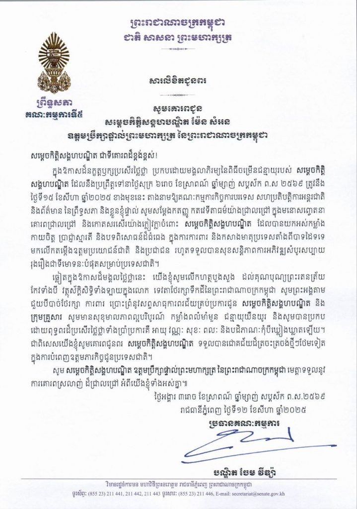 សារលិខិតជូនពររបស់ឯកឧត្តមបណ្ឌិត ចែម វីឌ្យ៉ា ប្រធានគណៈកម្មការទី៥ព្រឹទ្ធសភា សូមគោរពជូនសម្តេចកិត្តិសង្គហបណ្ឌិត ម៉ែន សំអន ឧត្តមប្រឹក្សាផ្ទាល់ព្រះមហាក្សត្រ នៃព្រះរាជាណាចក្រកម្ពុជា ក្នុងឱកាសដ៏នក្ខត្តឫក្សប្រសើរថ្លៃថ្លា ប្រកបដោយមង្គលាភិរម្យនៃពិធីចម្រើនជន្មាយុរបស់សម្តេចកិត្តិសង្គហបណ្ឌិត ដែលនឹងប្រព្រឹត្តទៅនាថ្ងៃសុក្រ ទី១៥ ខែសីហា ឆ្នាំ២០២៥ ខាងមុខនេះ
