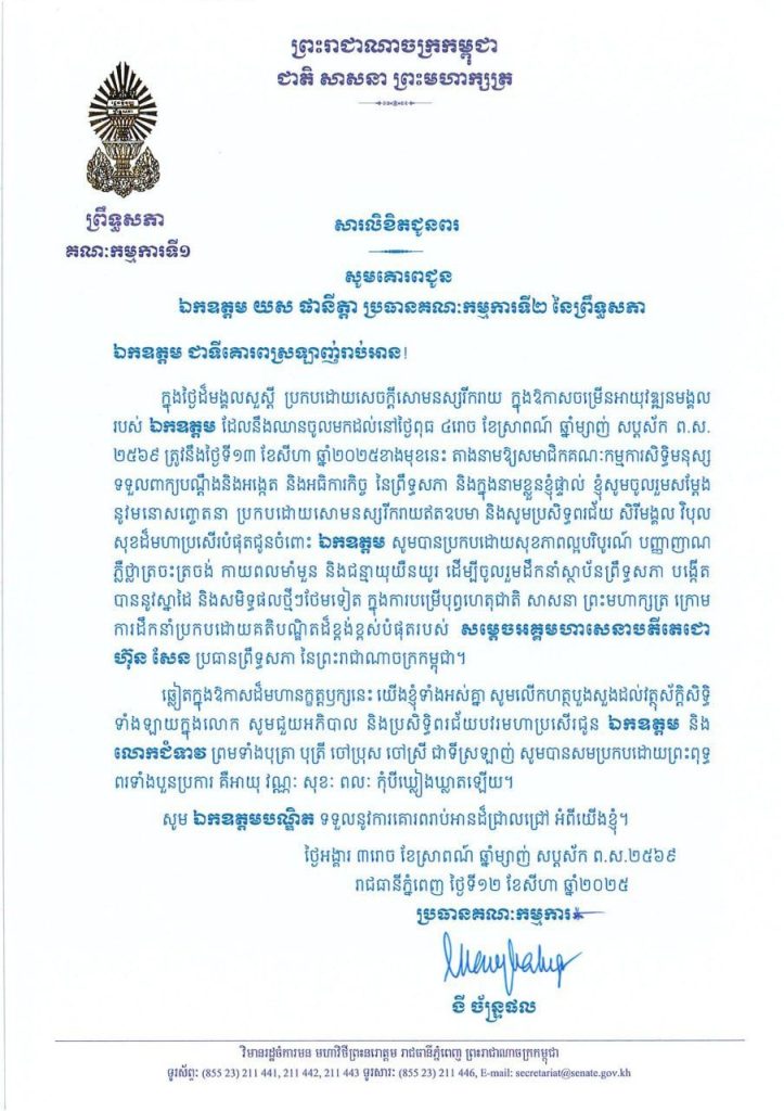 សារលិខិតជូនពររបស់ឯកឧត្តម ងី ច័ន្រ្ទផល ប្រធានគណៈកម្មការទី១ព្រឹទ្ធសភាគោរពជូនឯកឧត្តម យស ផានីត្តា ប្រធានគណៈកម្មការទី២ នៃព្រឹទ្ធសភា ក្នុងថ្ងៃដ៏មង្គលសួស្តី ប្រកបដោយសេចក្តីសោមនស្សរីករាយ ក្នុងឱកាសចម្រើនអាយុវឌ្ឍនមង្គលរបស់ឯកឧត្តម ដែលនឹងឈានចូលមកដល់នៅថ្ងៃពុធ ទី១៣ ខែសីហា ឆ្នាំ២០២៥ខាងមុខនេះ