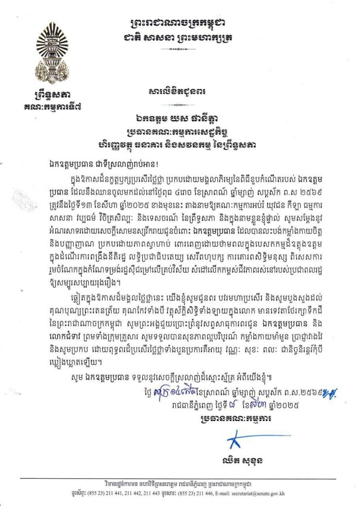 សារលិខិតជូនពររបស់ឯកឧត្តម ឈិត សុខុន ប្រធានគណៈកម្មការទី៧ព្រឹទ្ធសភា គោរពជូនឯកឧត្តម យស ផានីត្តា ប្រធានគណៈកម្មការសេដ្ឋកិច្ច ហិរញ្ញវត្ថុ ធនាគារ និងសវនកម្ម នៃព្រឹទ្ធសភា ក្នុងឱកាសដ៏នក្ខត្តឫក្សប្រសើរថ្លៃថ្លា ប្រកបដោយមង្គលាភិរម្យនៃពិធីខួបកំណើតរបស់ ឯកឧត្តមប្រធាន ដែលនឹងឈានចូលមកដល់នៅថ្ងៃពុធ ទី១៣ ខែសីហា ឆ្នាំ២០២៥ ខាងមុខនេះ