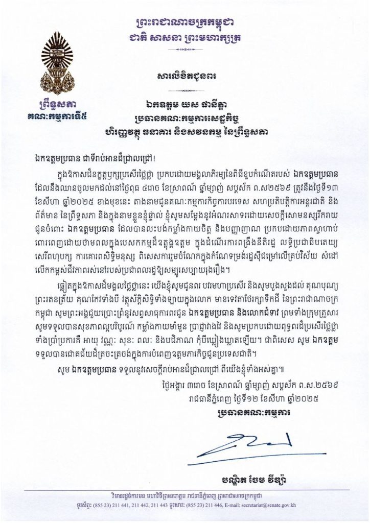 • សារលិខិតជូនពររបស់ឯកឧត្តមបណ្ឌិត ចែម វីឌ្យ៉ា ប្រធានគណៈកម្មការ​ទី៥ព្រឹទ្ធសភា គោរពជូនឯកឧត្តម យស ផានីត្តា ប្រធានគណៈកម្មការសេដ្ឋកិច្ច ហិរញ្ញវត្ថុ ធនាគារ និងសវនកម្ម នៃព្រឹទ្ធសភា ក្នុងឱកាសដ៏នក្ខត្តឫក្សប្រសើរថ្លៃថ្លា ប្រកបដោយមង្គលាភិរម្យនៃពិធីខួបកំណើតរបស់ឯកឧត្តមប្រធាន ដែលនឹងឈានចូលមកដល់នៅថ្ងៃពុធ ទី១៣ ខែសីហា ឆ្នាំ២០២៥ ខាងមុខនេះ