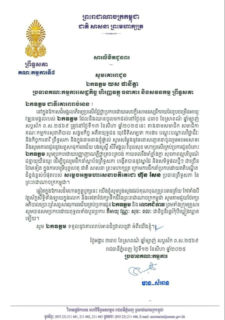 សារលិខិតជូនពររបស់លោកជំទាវ មាន សំអាន ប្រធានគណៈកម្មការទី៨ព្រឹទ្ធសភា គោរពជូនឯកឧត្តម យស ផានីត្តា ប្រធានគណៈកម្មការសេដ្ឋកិច្ច ហិរញ្ញវត្ថុ ធនាគារ និងសវនកម្ម នៃព្រឹទ្ធសភា ក្នុងឱកាសដ៏មង្គលាភិរម្យប្រសើរថ្លៃថ្លាប្រកបដោយសេចក្តីសោមនស្សរីករាយនៃខួបចម្រើនអាយុ វឌ្ឍនមង្គលរបស់ឯកឧត្តម ដែលឈានចូលមកដល់នៅថ្ងៃពុធ ទី១៣ ខែសីហា ឆ្នាំ២០២៥ នេះ