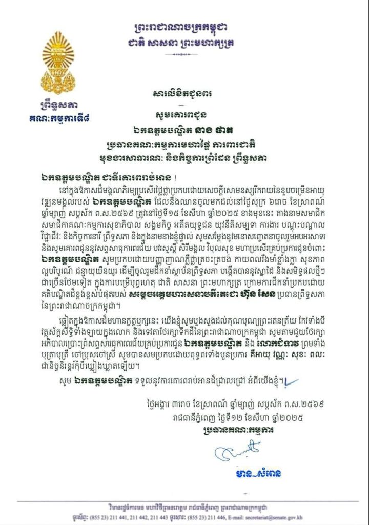 សារលិខិតជូនពររបស់លោកជំទាវ មាន សំអាន ប្រធានគណៈកម្មការទី៨ព្រឹទ្ធសភា គោរពជូនឯកឧត្តមបណ្ឌិត នាង ផាត ប្រធានគណៈកម្មការមហាផ្ទៃ ការពារជាតិ មុខងារសាធារណៈ និងកិច្ចការព្រំដែន នៃព្រឹទ្ធសភា ក្នុងឱកាសដ៏មង្គលាភិរម្យប្រសើរថ្លៃថ្លាប្រកបដោយសេចក្តីសោមនស្សរីករាយនៃខួបចម្រើនអាយុវឌ្ឍនមង្គលរបស់ឯកឧត្តមបណ្ឌិត ដែលនឹងឈានចូលមកដល់នៅថ្ងៃសុក្រ ទី១៥ ខែសីហា ឆ្នាំ២០២៥ ខាងមុខនេះ