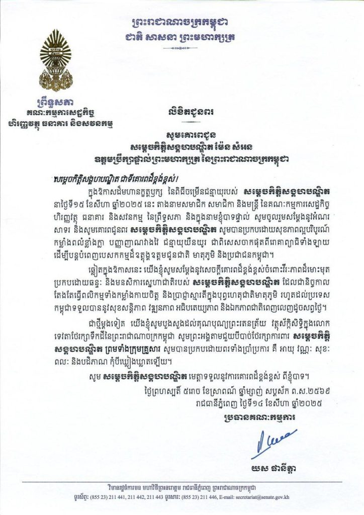 លិខិតជូនពររបស់ឯកឧត្តម យស ផានីត្តា ប្រធានគណៈកម្មការទី២ព្រឹទ្ធសភា គោរពជូនសម្តេចកិត្តិសង្គហបណ្ឌិត ម៉ែន សំអន ឧត្តមប្រឹក្សាផ្ទាល់ព្រះមហាក្សត្រ នៃព្រះរាជាណាចក្រកម្ពុជា ក្នុងឱកាសដ៏មហានក្ខត្តឫក្ស នៃពិធីចម្រើនជន្មាយុរបស់សម្តេចកិត្តិសង្គហបណ្ឌិត នាថ្ងៃទី១៥ ខែសីហា ឆ្នាំ២០២៥ នេះ