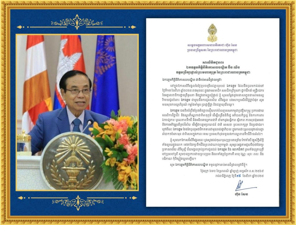 សារលិខិតជូនពររបស់សម្តេចអគ្គមហាសេនាបតីតេជោ ហ៊ុន សែន ប្រធានព្រឹទ្ធសភា នៃព្រះរាជាណាចក្រកម្ពុជា ជូនឯកឧត្តមកិត្តិនីតិកោសលបណ្ឌិត ប៊ិន ឈិន ឧត្តមប្រឹក្សាផ្ទាល់ព្រះមហាក្សត្រ នៃព្រះរាជាណាចក្រកម្ពុជា ក្នុងឱកាសសិរីមង្គលនៃថ្ងៃខួបចម្រើនជន្មាយុរបស់ឯកឧត្តម នៅថ្ងៃទី១៧ ខែសីហា ឆ្នាំ២០២៥ នេះ