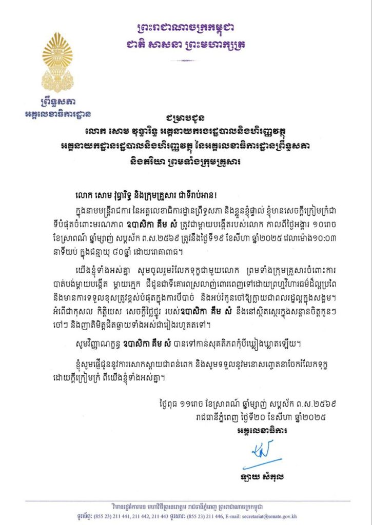 • សារលិខិត​រំលែកទុក្ខរបស់​ឯកឧត្ដម ឡាយ សំកុល អគ្គលេខាធិការ​ព្រឹទ្ធសភា​  ជូនលោក សោម វុធ្ធារិទ្ធ អគ្គនាយករងរដ្ឋបាលនិងហិរញ្ញវត្ថុ អគ្គនាយកដ្ឋានរដ្ឋបាលនិងហិរញ្ញវត្ថុ នៃអគ្គលេខាធិការដ្ឋានព្រឹទ្ធសភា និងភរិយា ព្រមទាំងក្រុមគ្រួសារ ចំពោះមរណភាព ឧបាសិកា គឹម សំ ត្រូវជាម្តាយបង្កើតរបស់លោក កាលពីថ្ងៃអង្គារ ទី១៩ ខែសីហា ឆ្នាំ២០២៥ វេលាម៉ោង១០:០៣ នាទីយប់ ក្នុងជន្មាយុ ៨០ឆ្នាំ ដោយរោគាពាធ