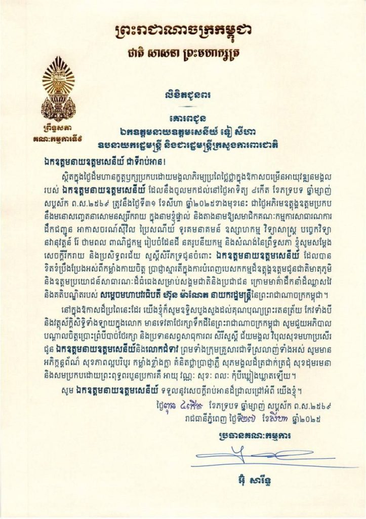 លិខិតជូនពររបស់ឯកឧត្តម អ៊ុំ សារឹទ្ធ ប្រធានគណៈកម្មការទី៩ព្រឹទ្ធសភា គោរពជូនឯកឧត្តមនាយឧត្តមសេនីយ៍ ទៀ សីហា ឧបនាយករដ្ឋមន្ត្រី និងជារដ្ឋមន្ត្រីក្រសួងការពារជាតិ ក្នុងឱកាសចម្រើនអាយុវឌ្ឍនមង្គលរបស់ឯកឧត្តមនាយឧត្តមសេនីយ៍ ដែលនឹងចូលមកដល់នៅថ្ងៃអាទិត្យ ទី៣១ ខែសីហា ឆ្នាំ២០២៥ខាងមុខនេះ